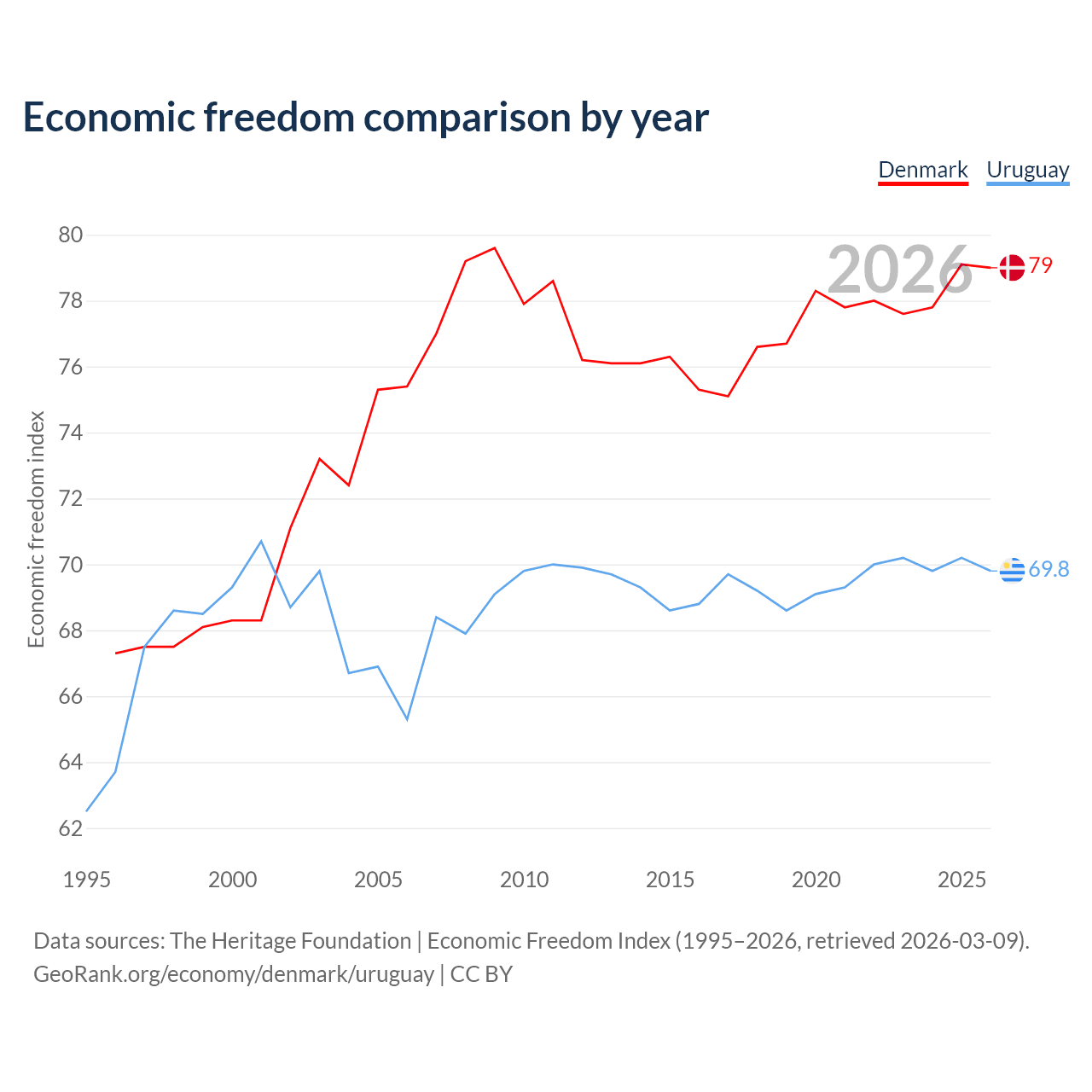 The Economic Freedom Index for Denmark is 79, ranking 8/197, compared to 69.8 for Uruguay, ranking 39/197. The chart above displays a comparison of annual changes in economic freedom indexes.