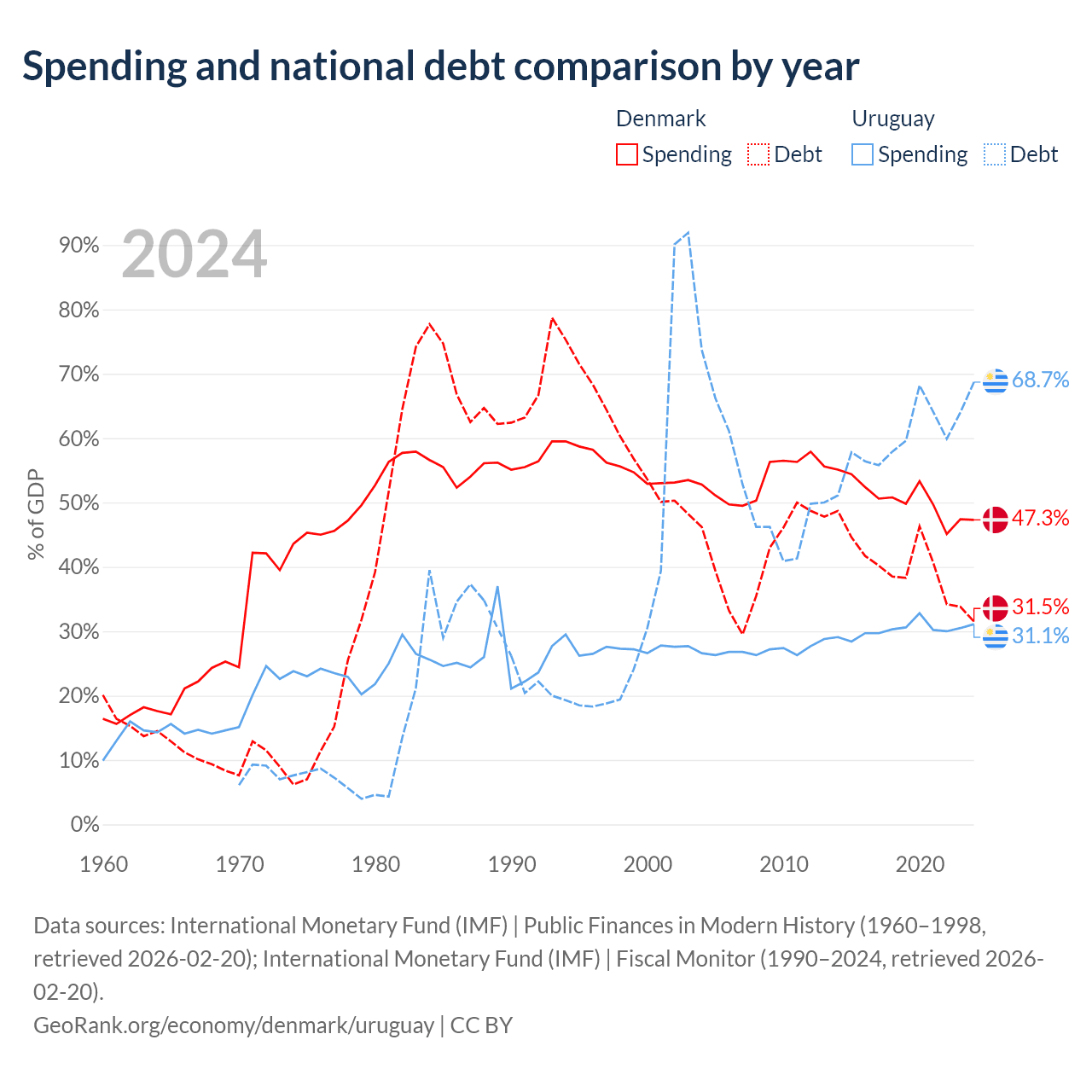 Denmark has $134B in government debt (31.5% of GDP), compared to $55.6B (68.7% of GDP) in Uruguay.