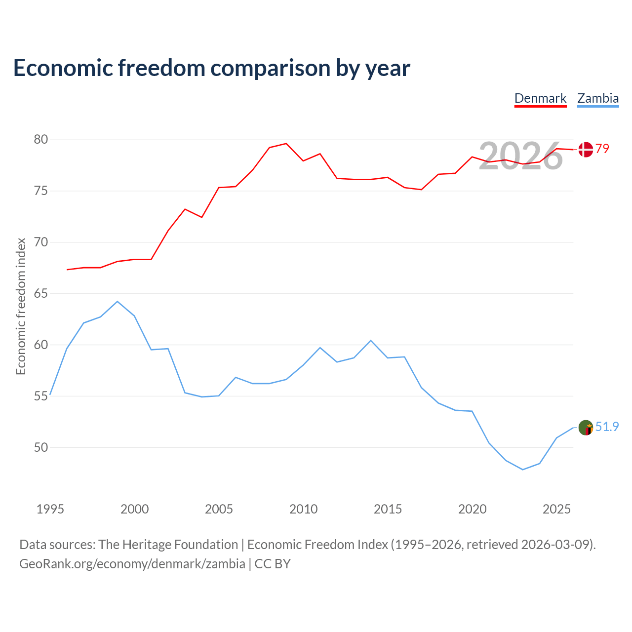 The Economic Freedom Index for Denmark is 79, ranking 8/197, compared to 51.9 for Zambia, ranking 152/197. The chart above displays a comparison of annual changes in economic freedom indexes.