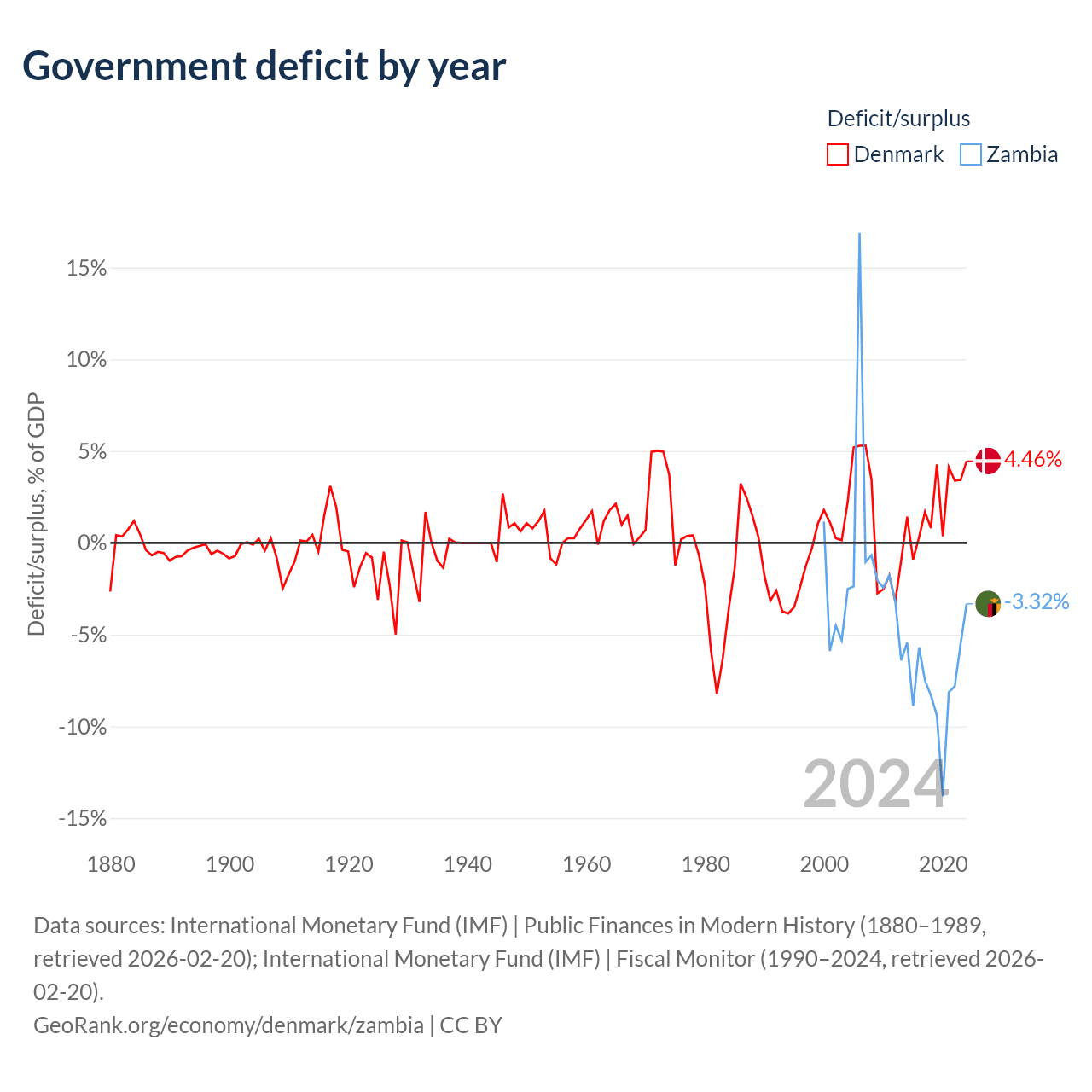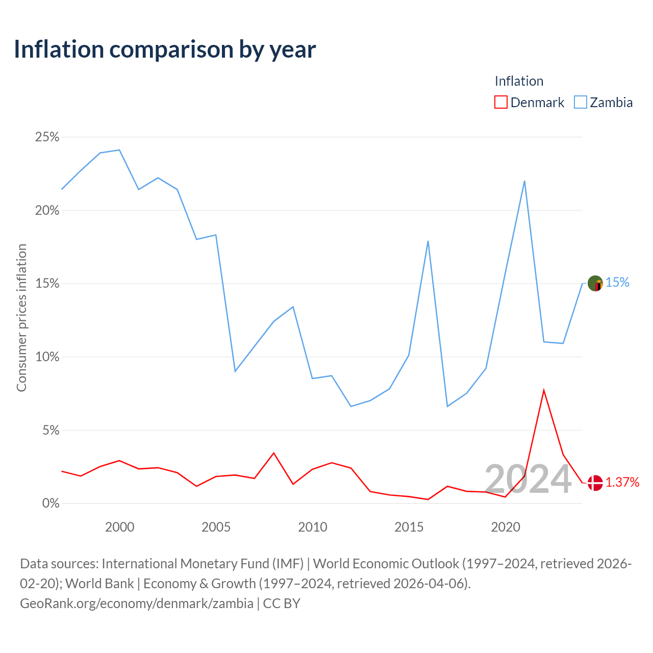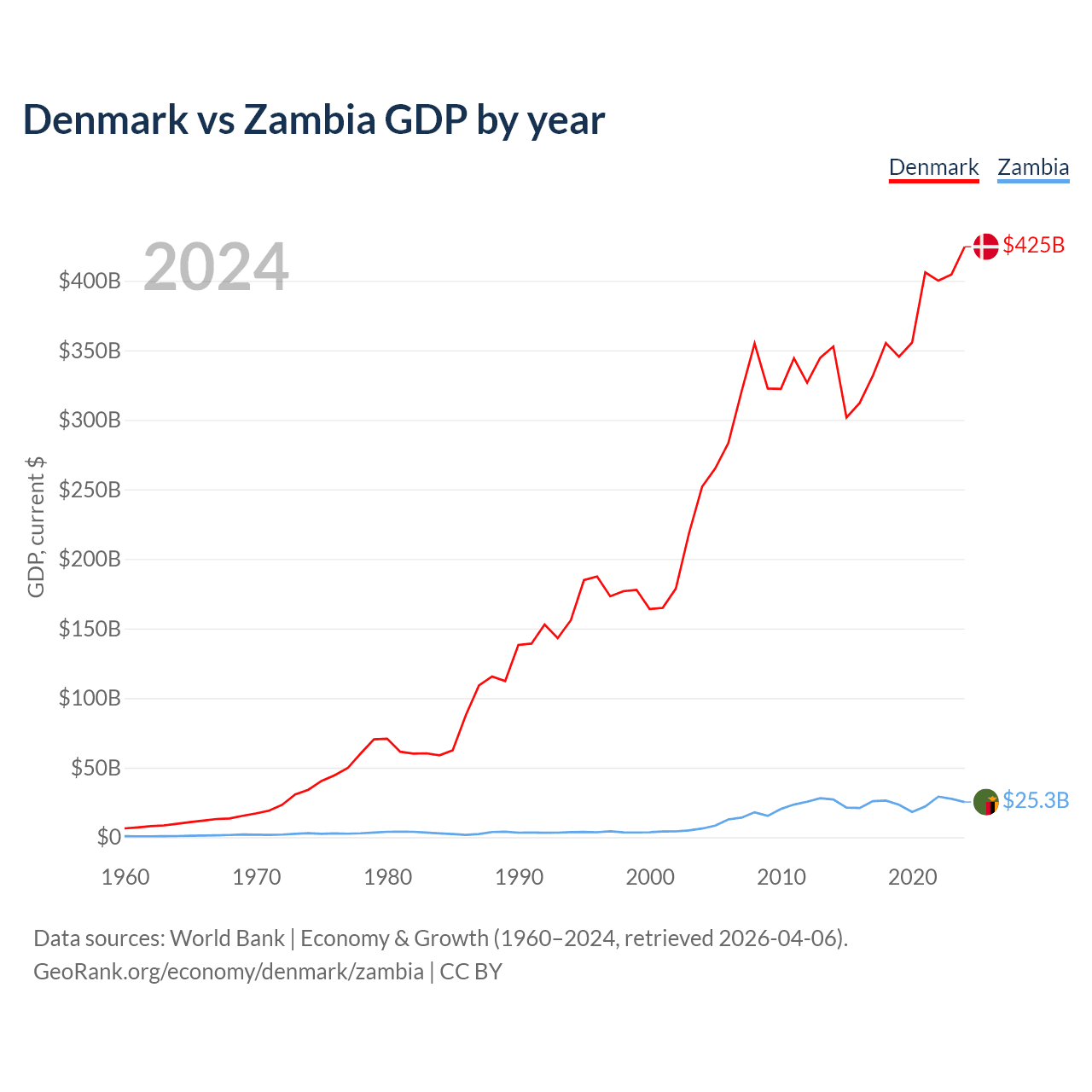 Denmark has a GDP of $425B compared to $25.3B for Zambia, ranking 37/197 and 116/197 by economy size, respectively.