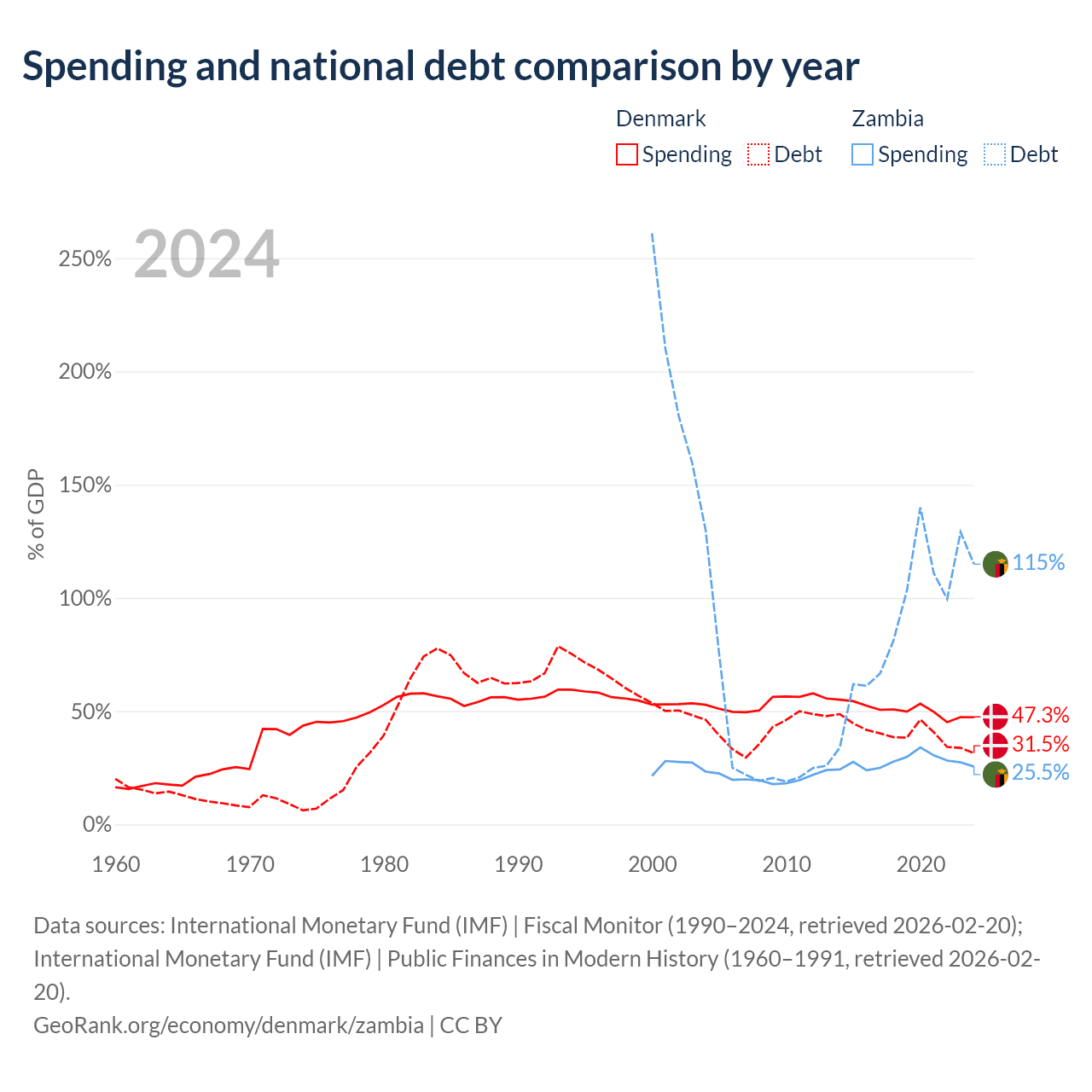 Denmark has $134B in government debt (31.5% of GDP), compared to $29.1B (114.9% of GDP) in Zambia.