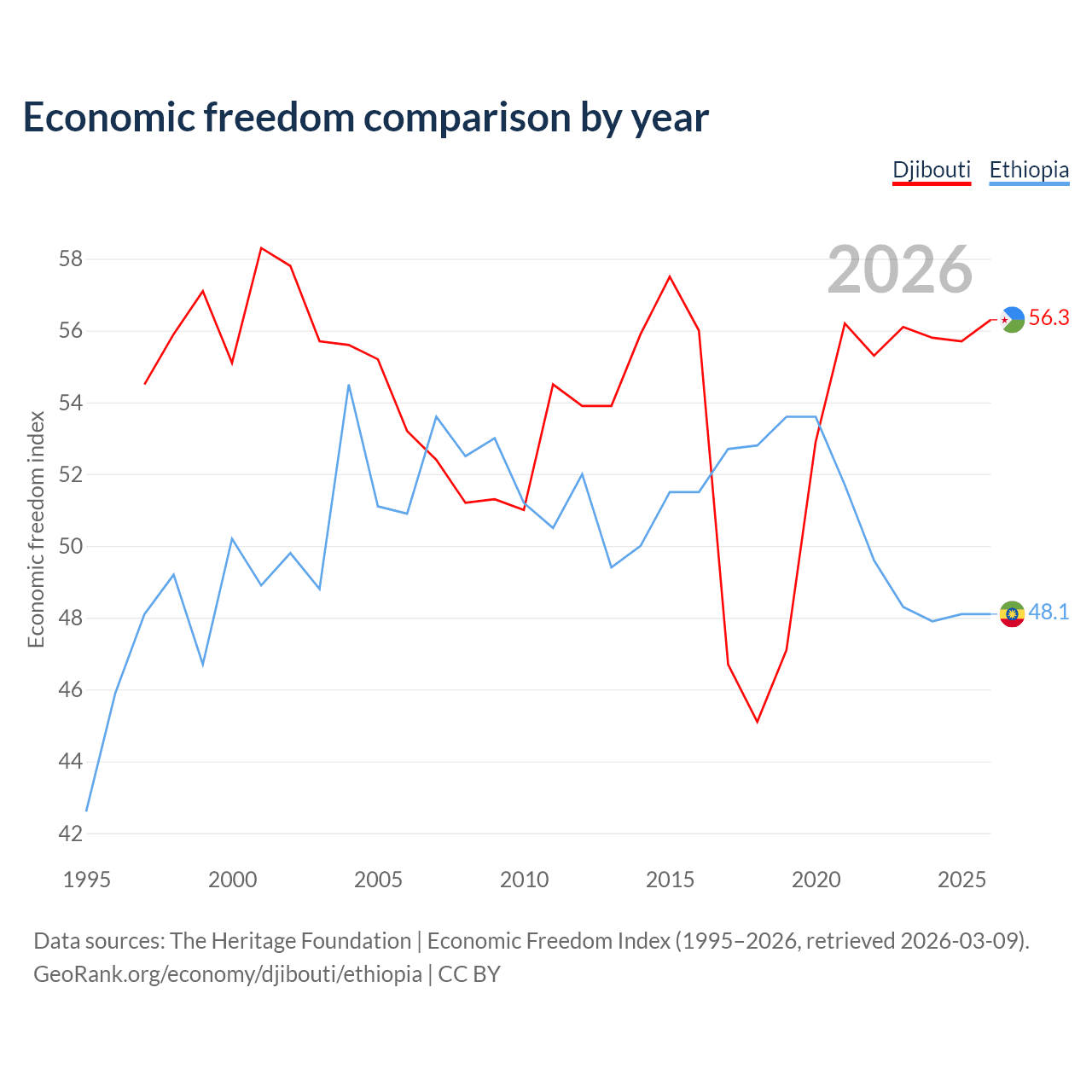 The Economic Freedom Index for Djibouti is 56.3, ranking 122/197, compared to 48.1 for Ethiopia, ranking 171/197. The chart above displays a comparison of annual changes in economic freedom indexes.