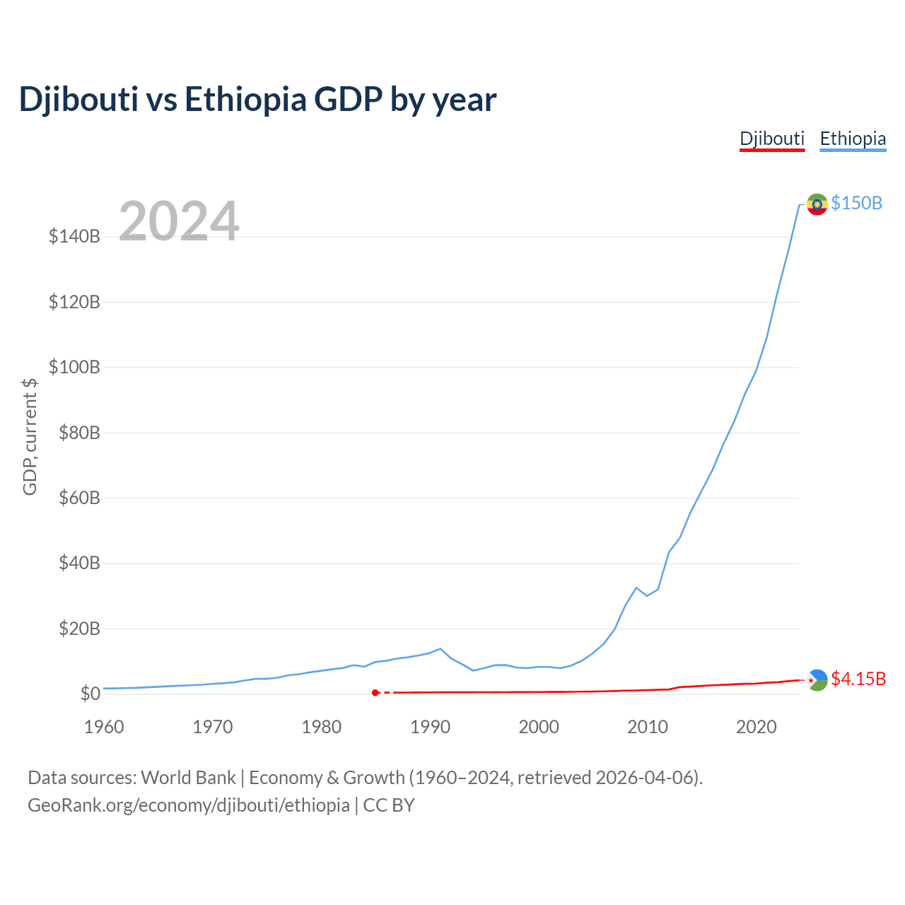 Djibouti has a GDP of $4.15B compared to $150B for Ethiopia, ranking 165/197 and 60/197 by economy size, respectively.