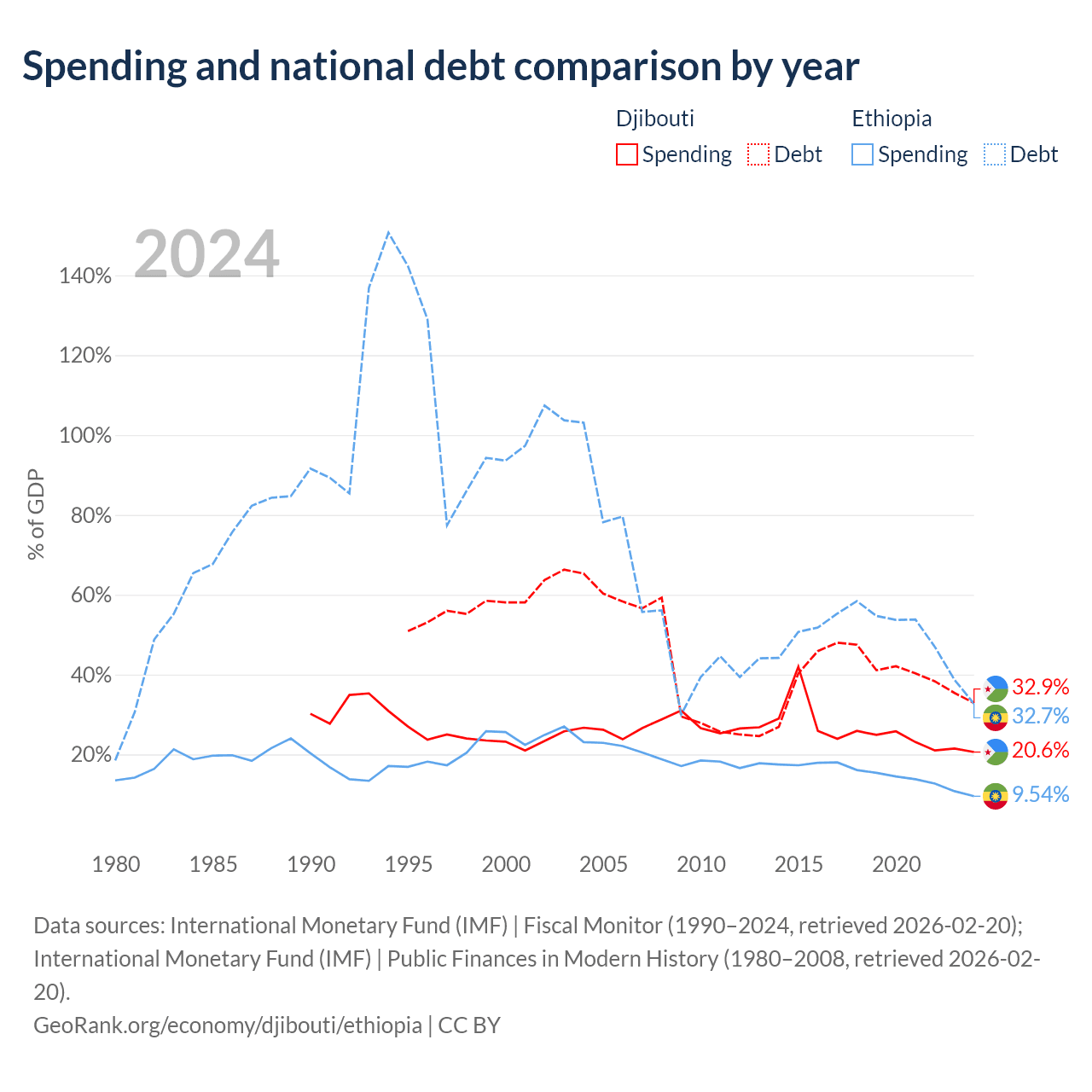 Djibouti has $1.36B in government debt (32.9% of GDP), compared to $48.9B (32.7% of GDP) in Ethiopia.