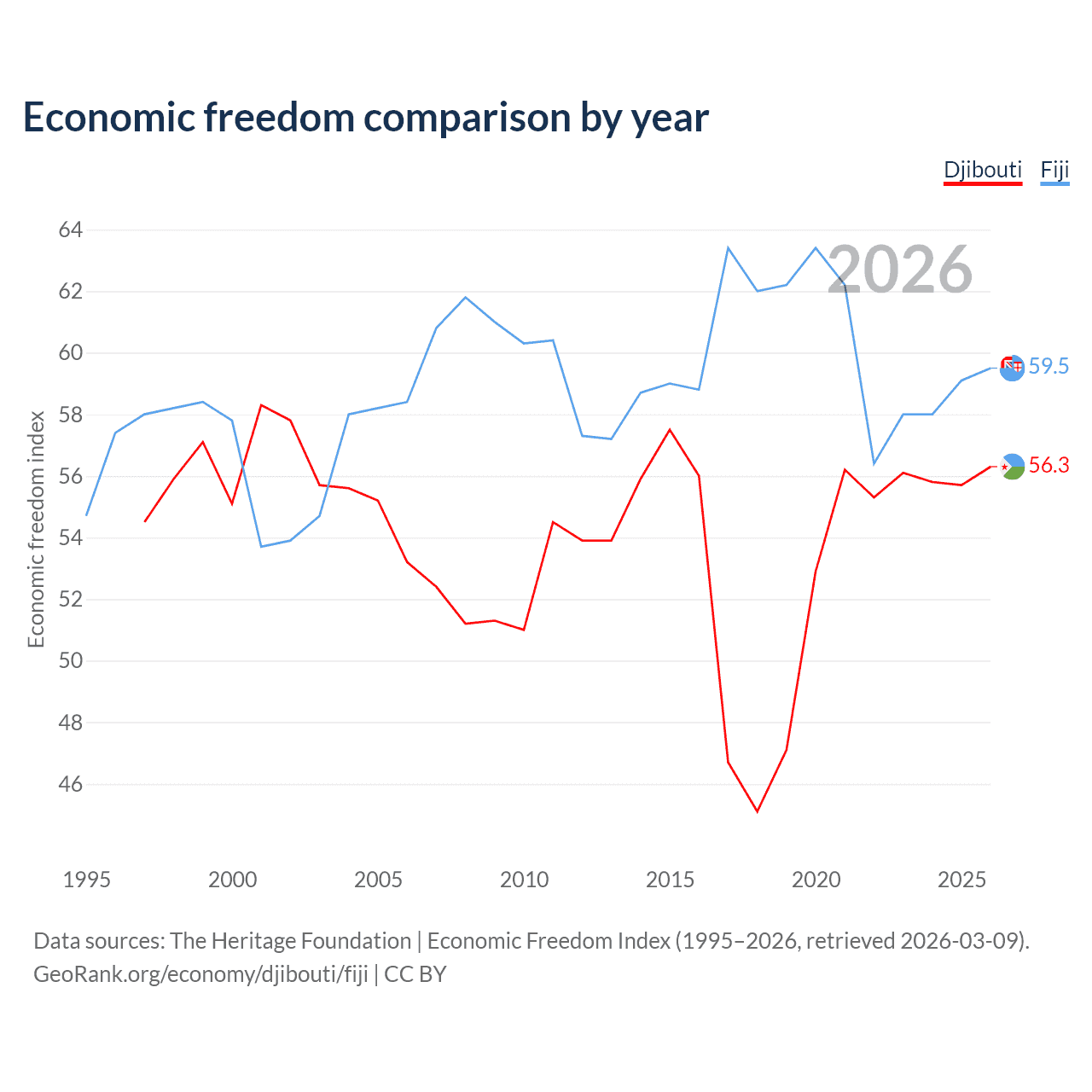 The Economic Freedom Index for Djibouti is 56.3, ranking 122/197, compared to 59.5 for Fiji, ranking 103/197. The chart above displays a comparison of annual changes in economic freedom indexes.