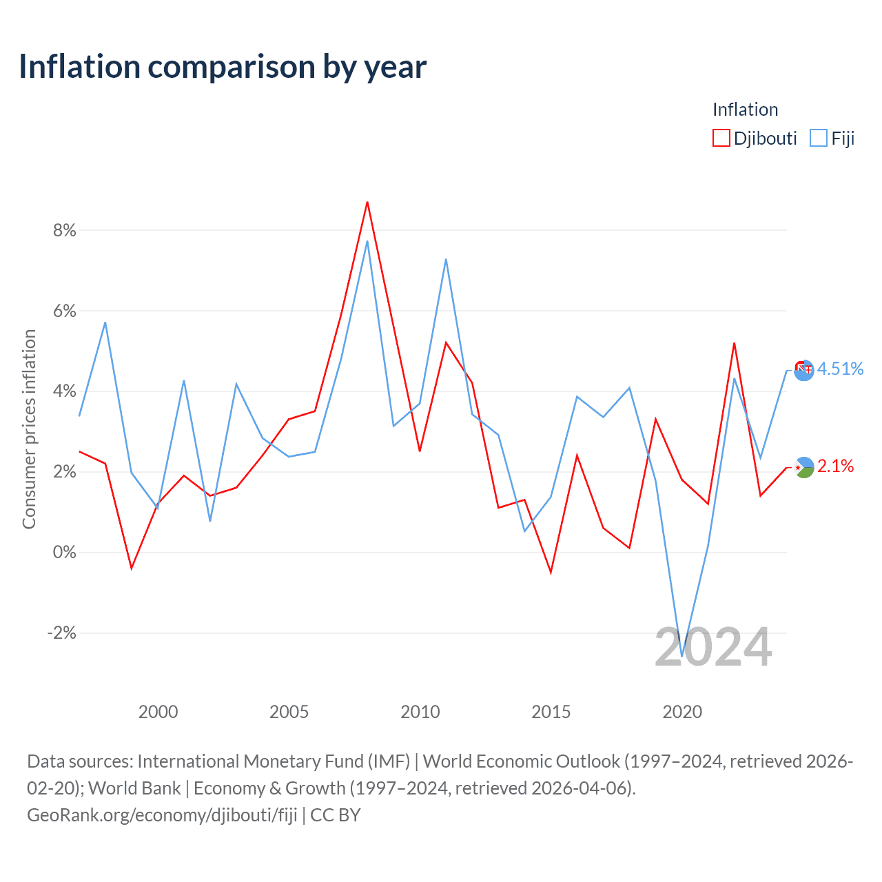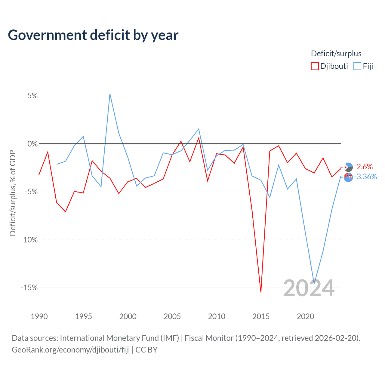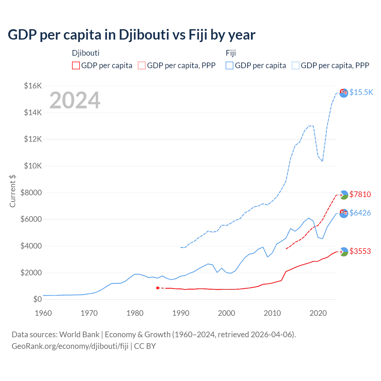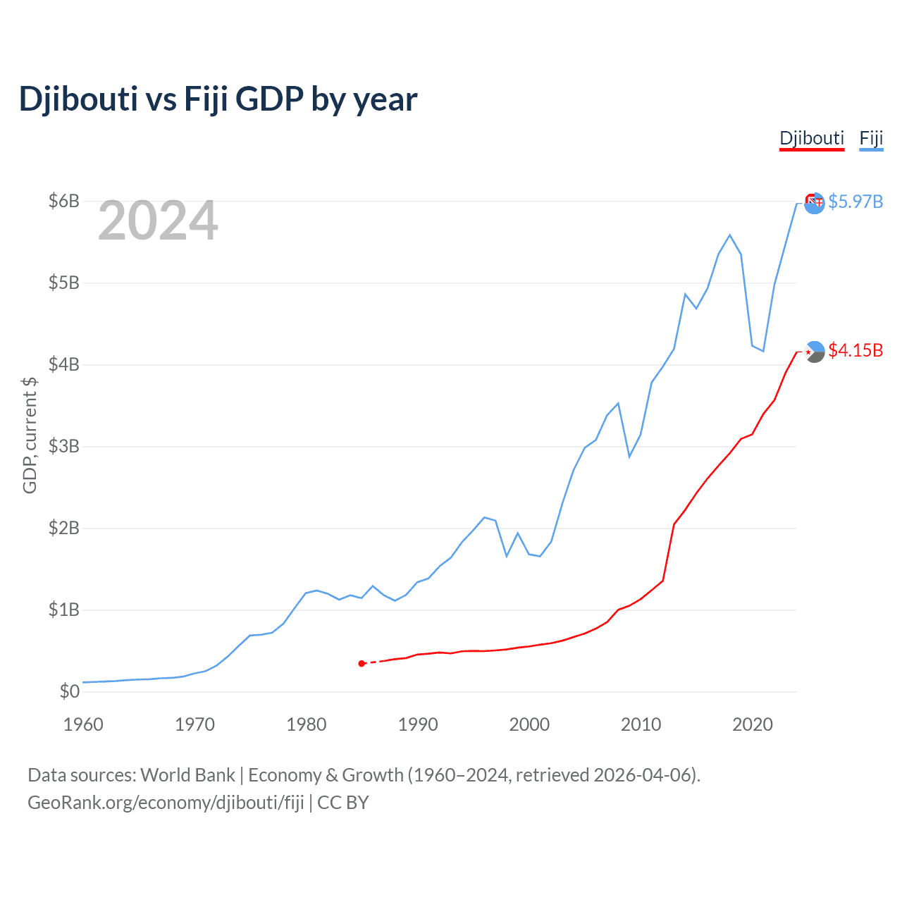 Djibouti has a GDP of $4.15B compared to $5.97B for Fiji, ranking 165/197 and 161/197 by economy size, respectively.