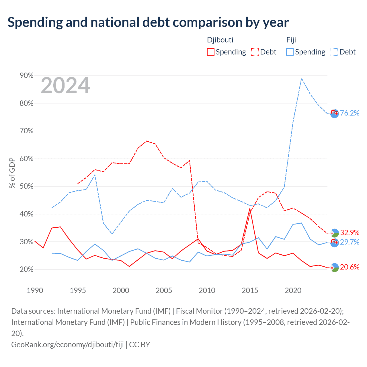 Djibouti has $1.36B in government debt (32.9% of GDP), compared to $4.54B (76.2% of GDP) in Fiji.