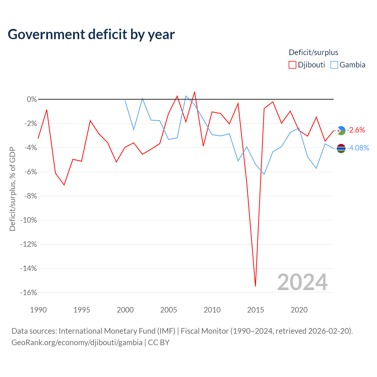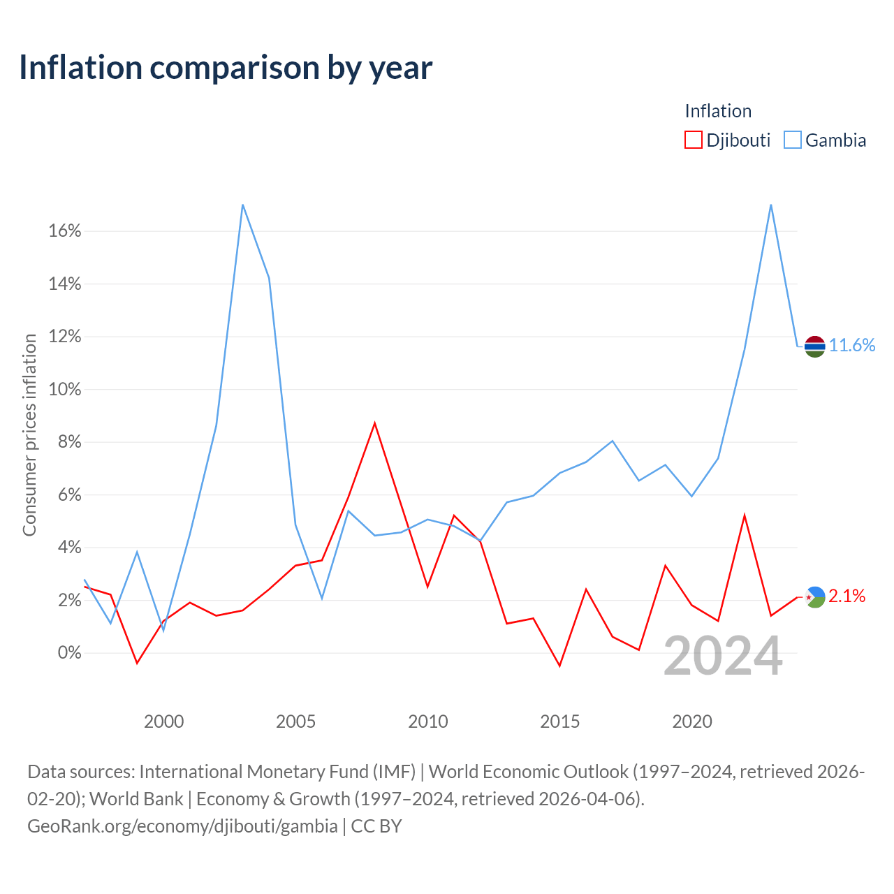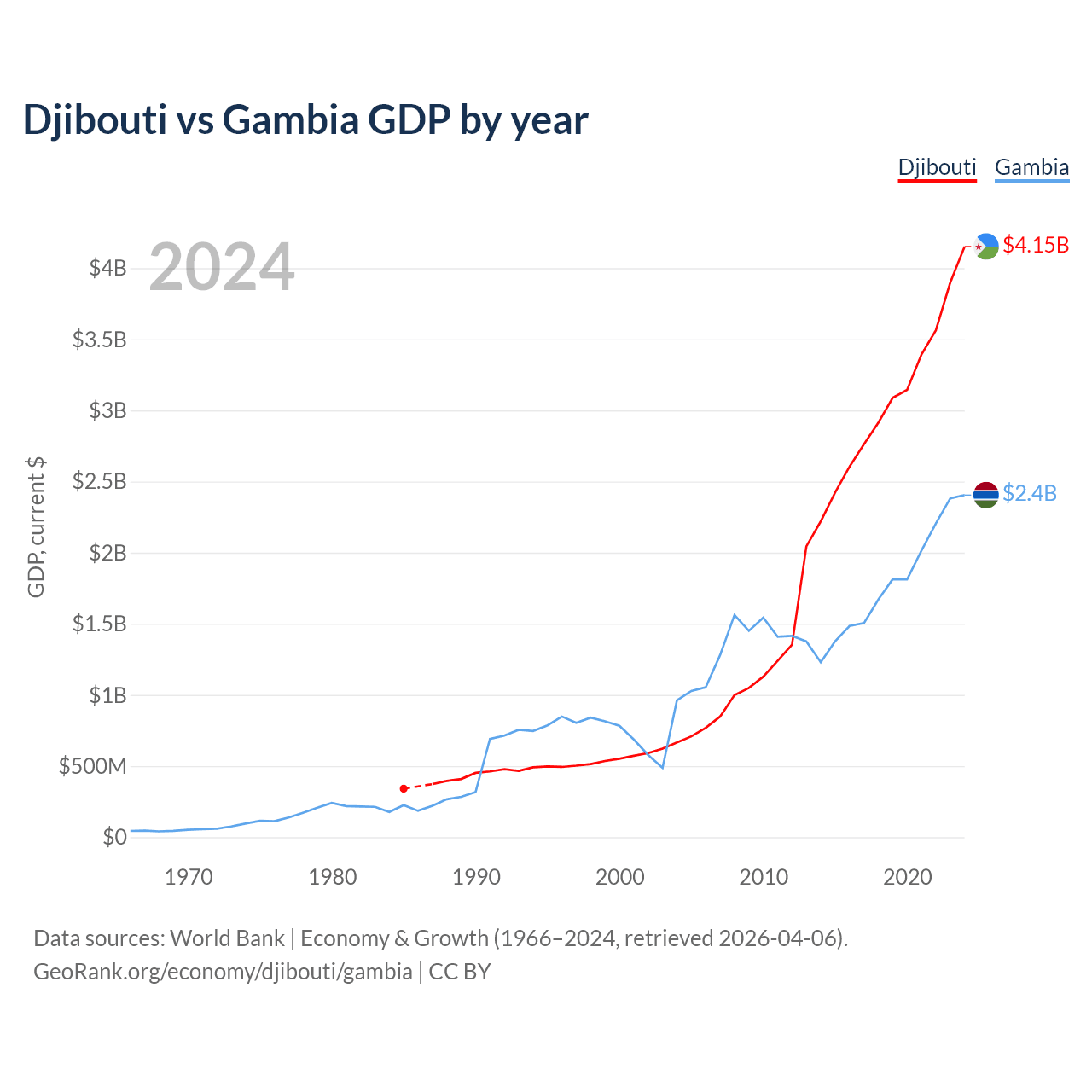 Djibouti has a GDP of $4.15B compared to $2.4B for the Gambia, ranking 165/197 and 174/197 by economy size, respectively.