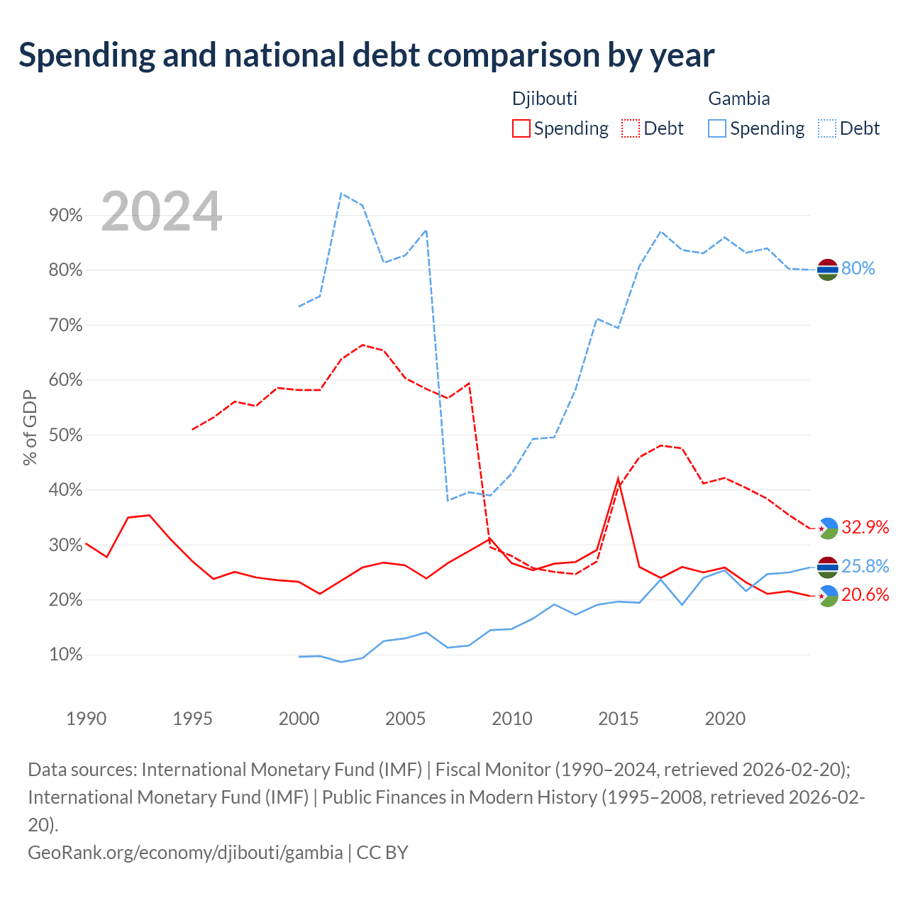 Djibouti has $1.36B in government debt (32.9% of GDP), compared to $1.92B (80% of GDP) in the Gambia.