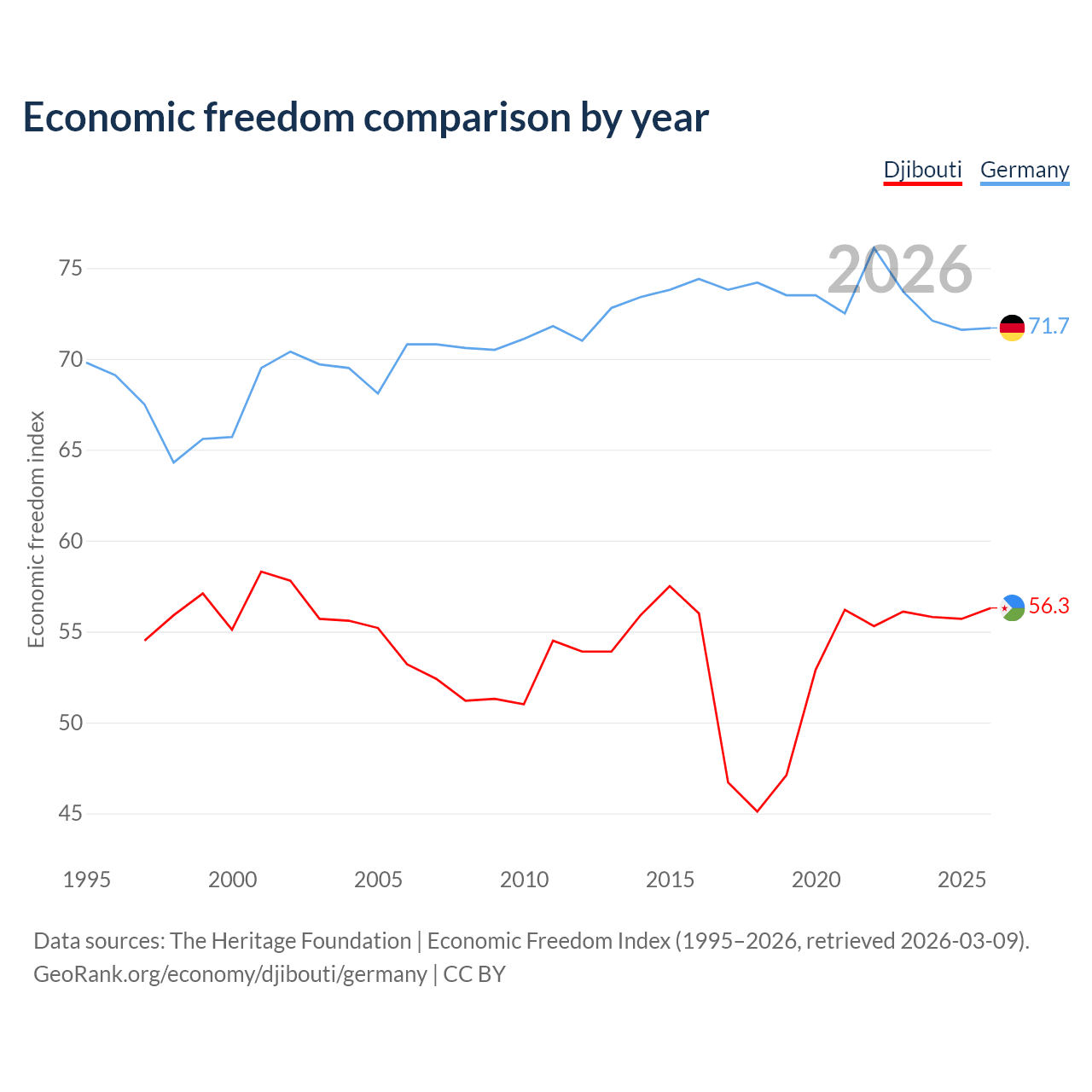 The Economic Freedom Index for Djibouti is 56.3, ranking 122/197, compared to 71.7 for Germany, ranking 30/197. The chart above displays a comparison of annual changes in economic freedom indexes.