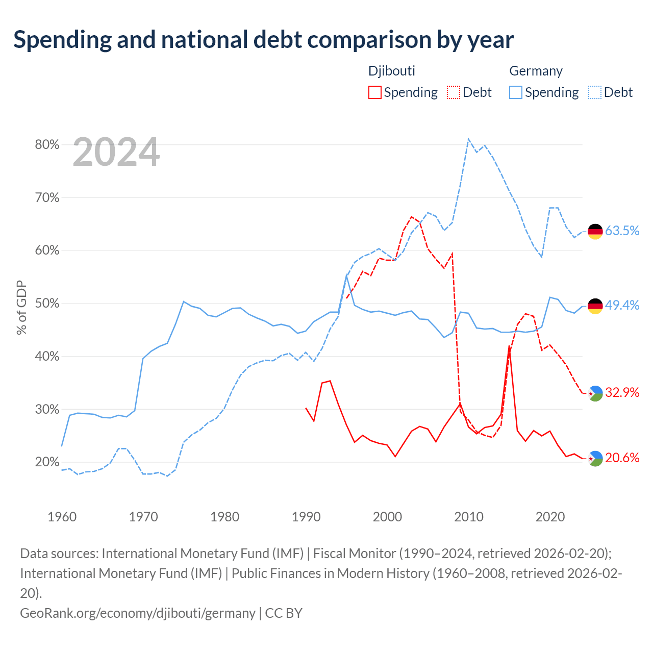 Djibouti has $1.36B in government debt (32.9% of GDP), compared to $2.97T (63.5% of GDP) in Germany.