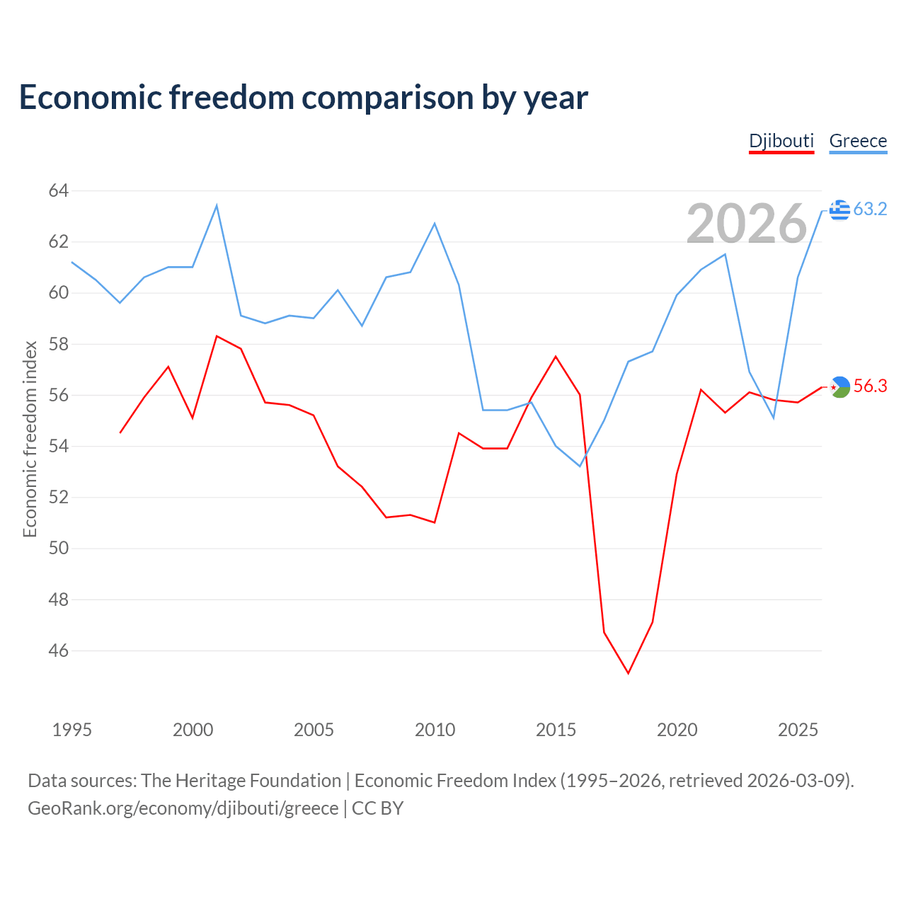 The Economic Freedom Index for Djibouti is 56.3, ranking 122/197, compared to 63.2 for Greece, ranking 82/197. The chart above displays a comparison of annual changes in economic freedom indexes.