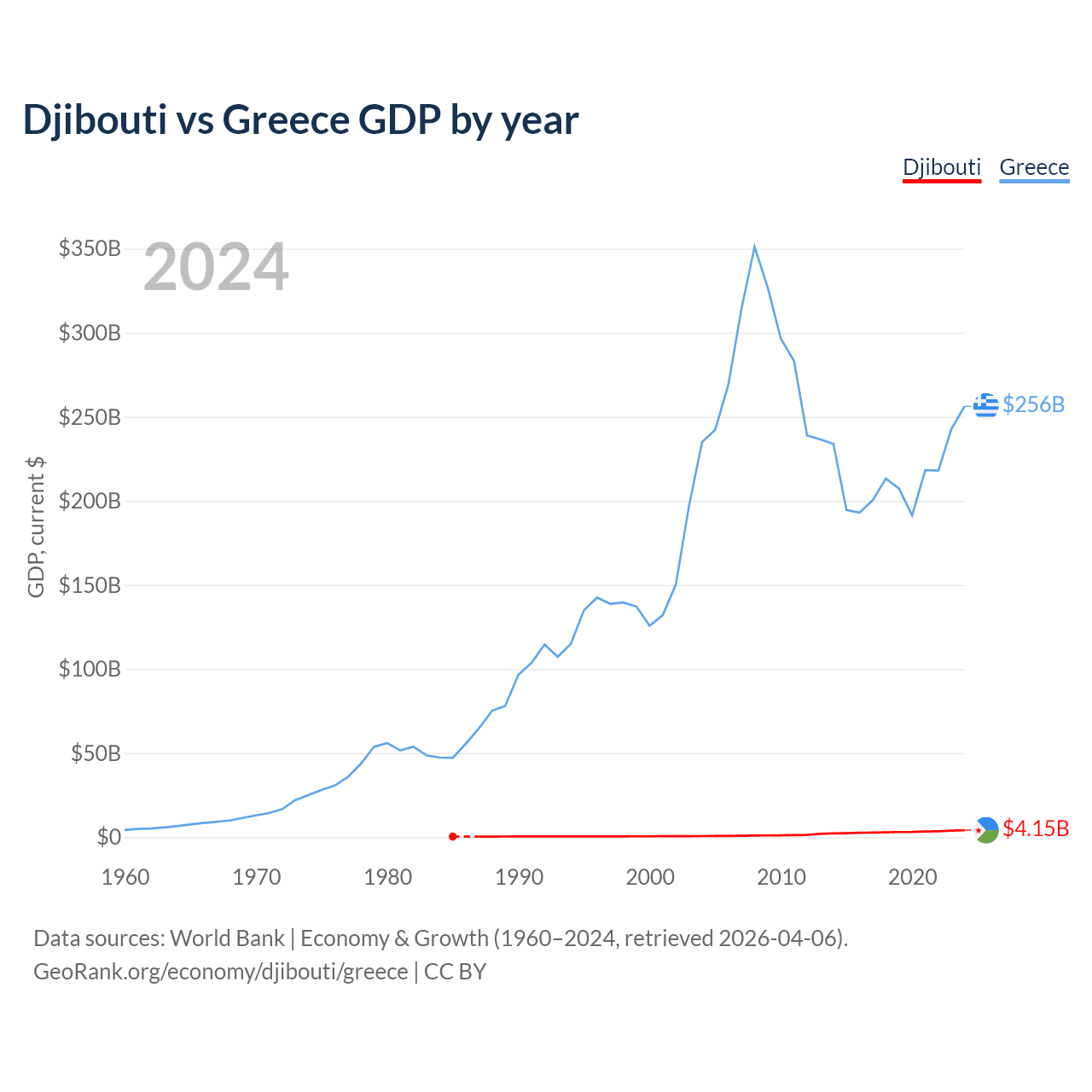 Djibouti has a GDP of $4.15B compared to $256B for Greece, ranking 165/197 and 53/197 by economy size, respectively.