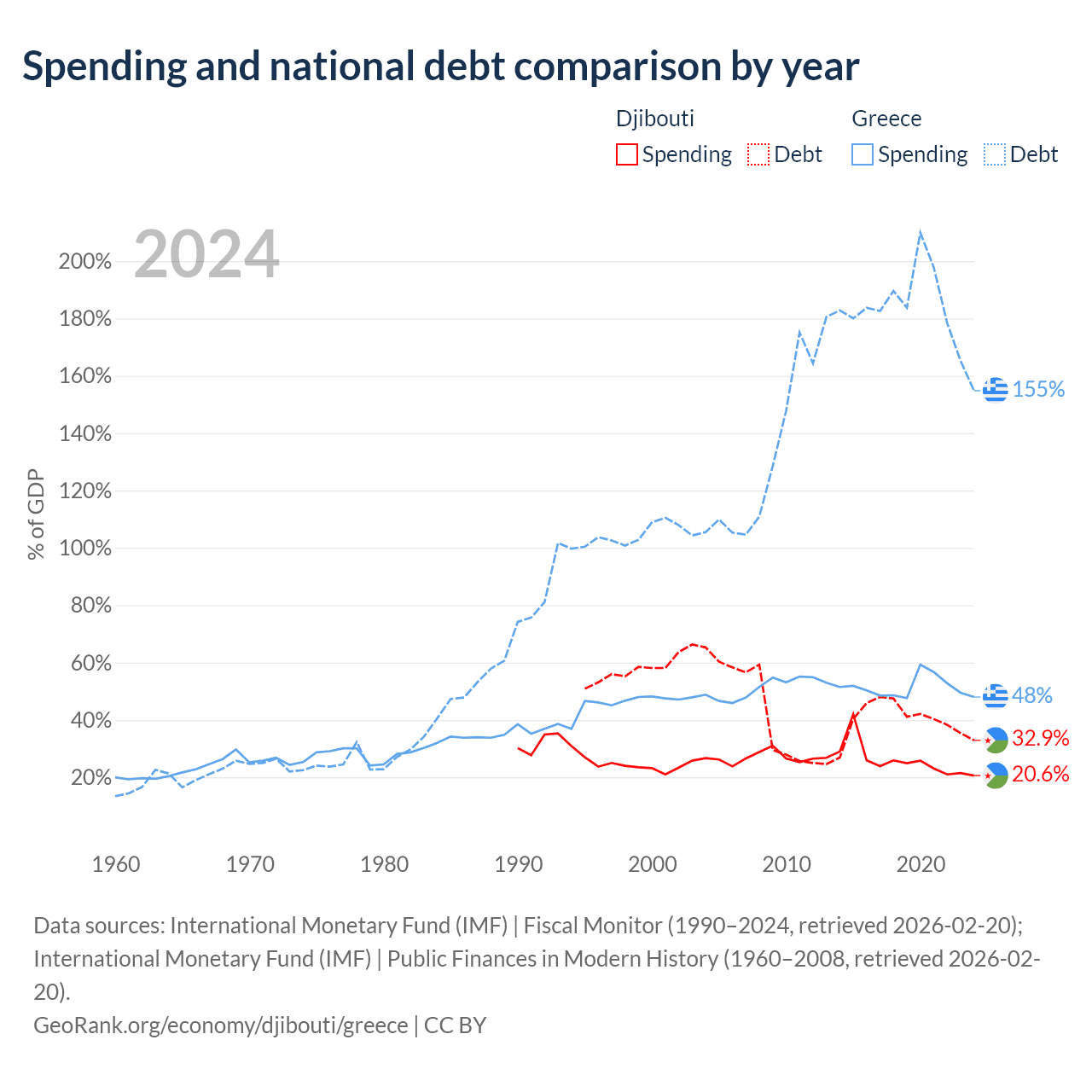 Djibouti has $1.36B in government debt (32.9% of GDP), compared to $397B (154.8% of GDP) in Greece.