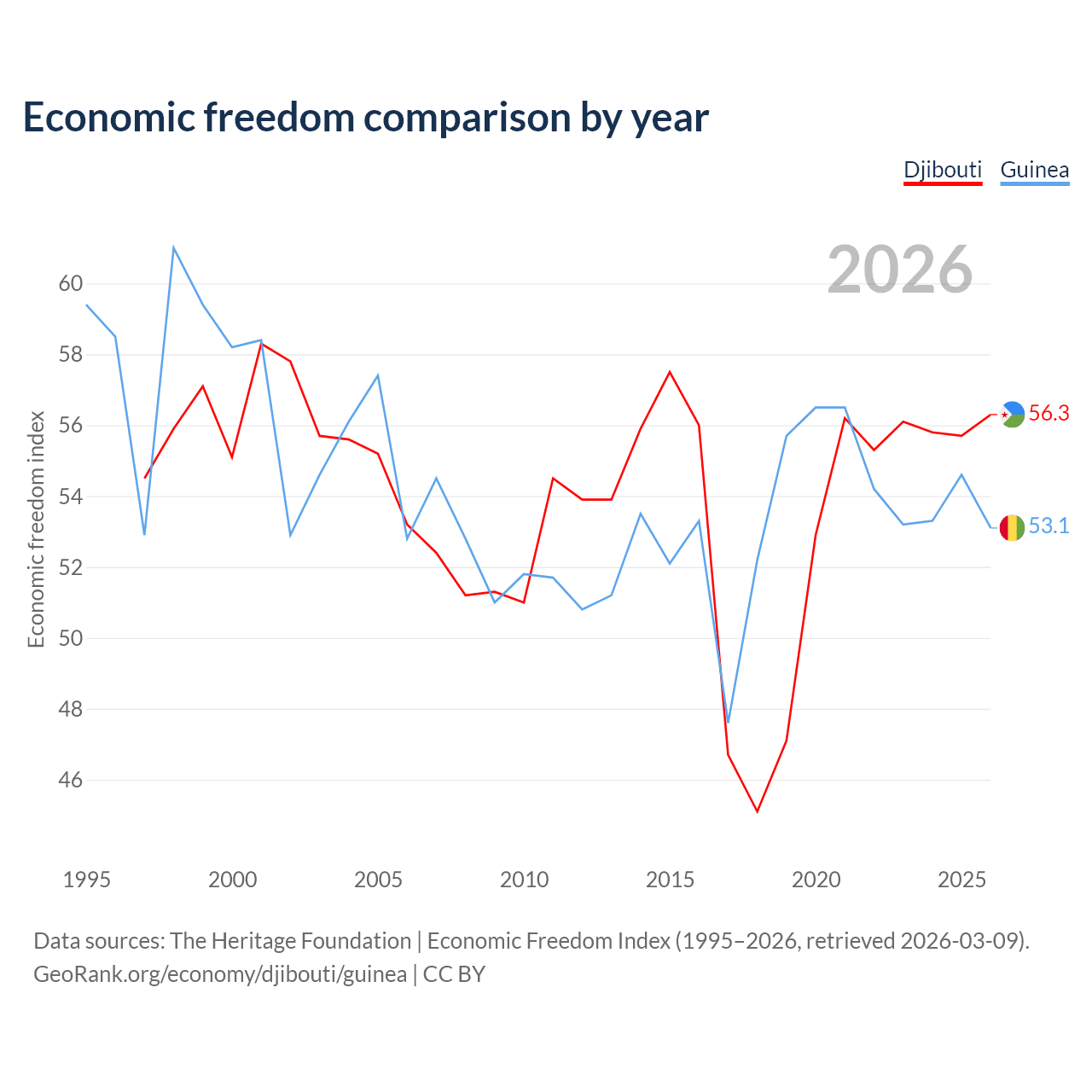 The Economic Freedom Index for Djibouti is 56.3, ranking 122/197, compared to 53.1 for Guinea, ranking 141/197. The chart above displays a comparison of annual changes in economic freedom indexes.