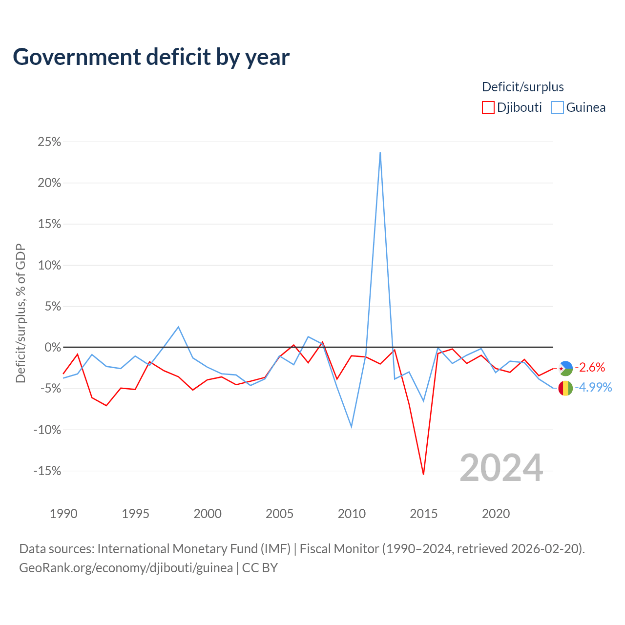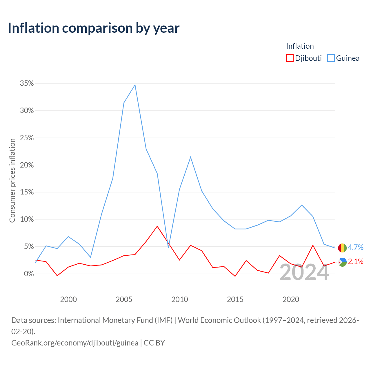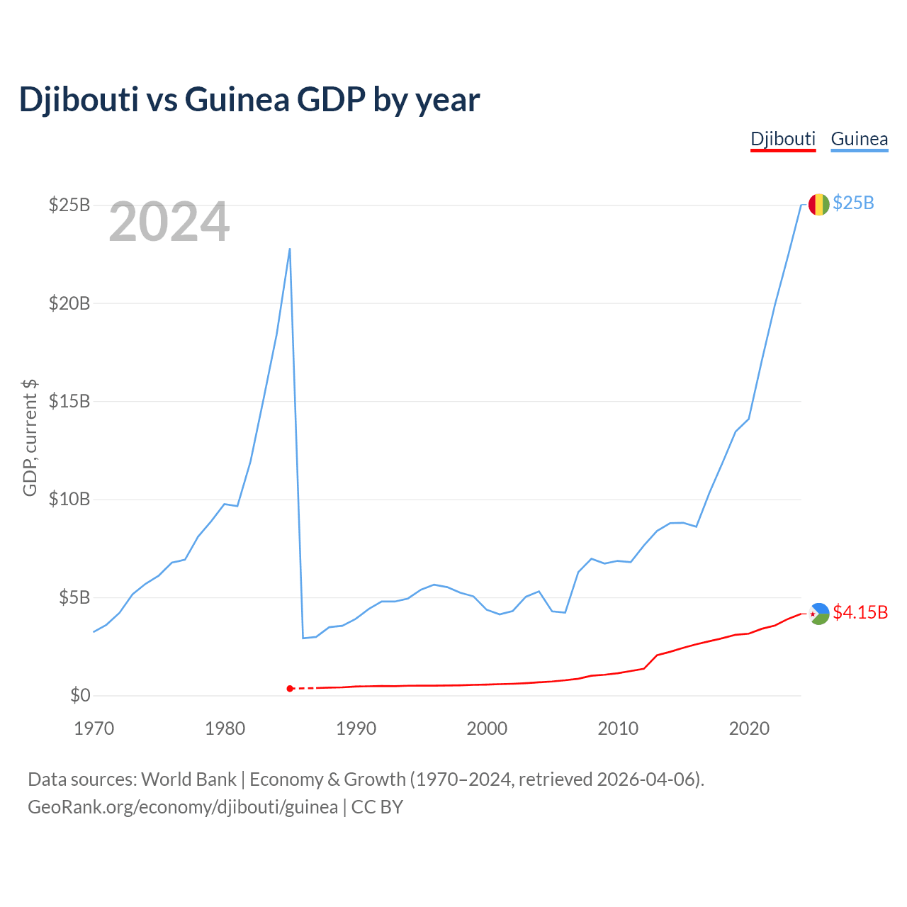 Djibouti has a GDP of $4.15B compared to $25B for Guinea, ranking 165/197 and 118/197 by economy size, respectively.