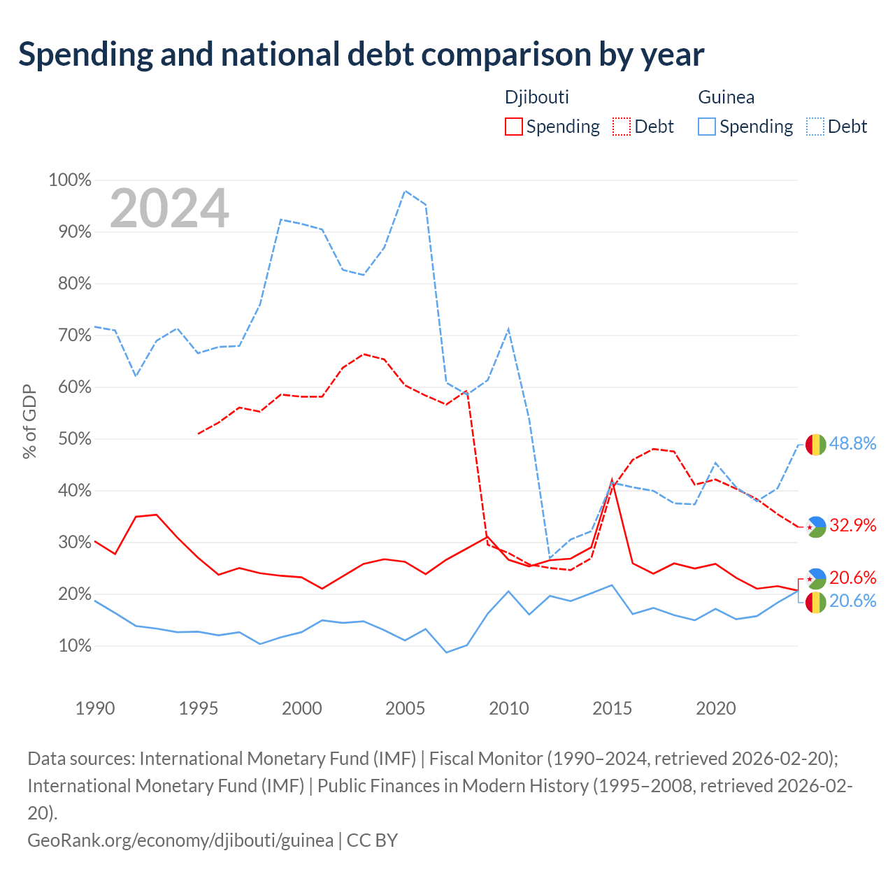 Djibouti has $1.36B in government debt (32.9% of GDP), compared to $12.2B (48.8% of GDP) in Guinea.