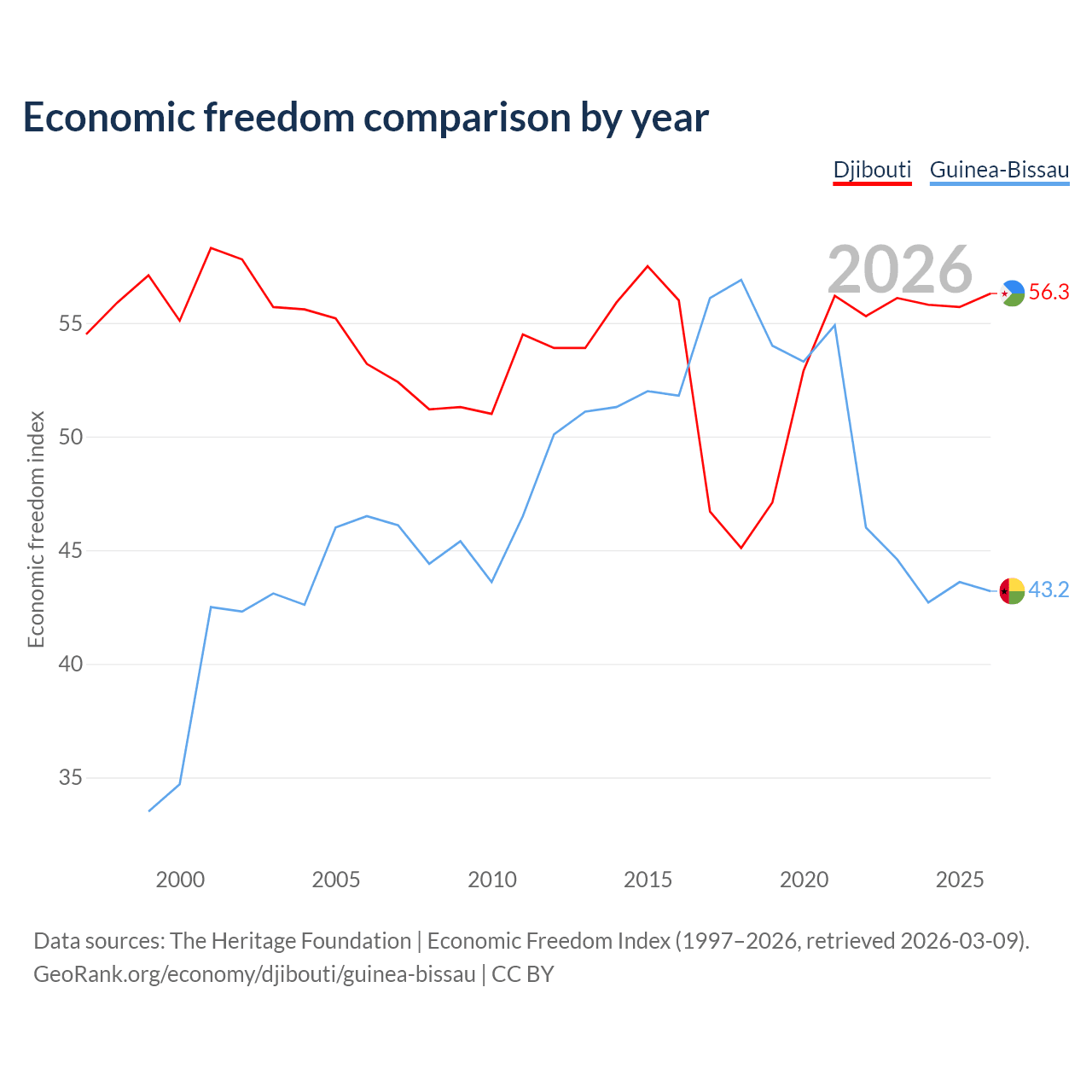 The Economic Freedom Index for Djibouti is 56.3, ranking 122/197, compared to 43.2 for Guinea-Bissau, ranking 181/197. The chart above displays a comparison of annual changes in economic freedom indexes.