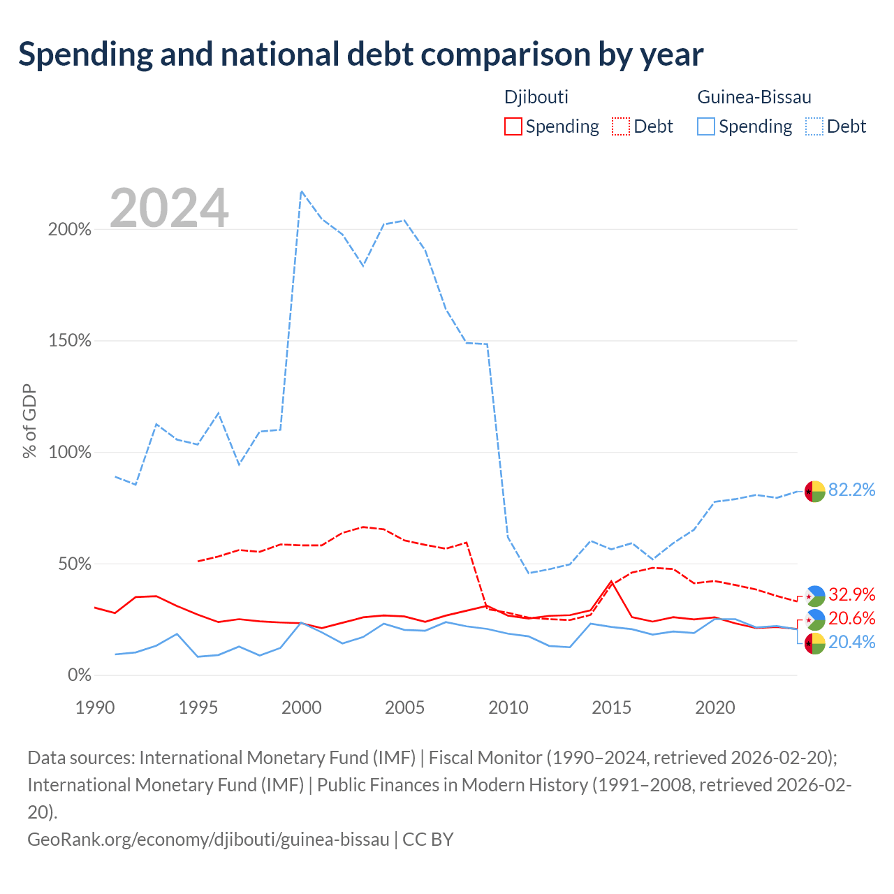 Djibouti has $1.36B in government debt (32.9% of GDP), compared to $1.82B (82.2% of GDP) in Guinea-Bissau.