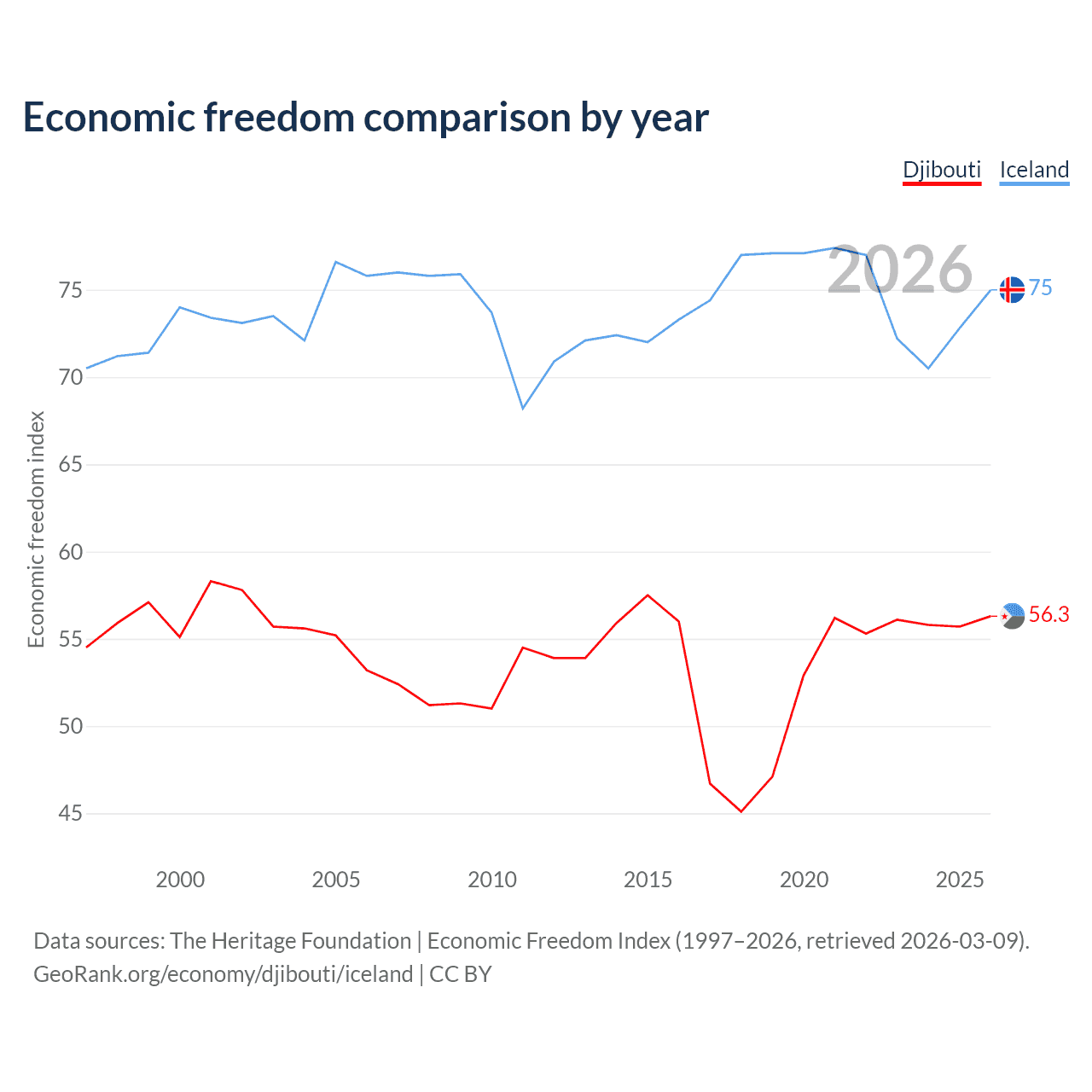 The Economic Freedom Index for Djibouti is 56.3, ranking 122/197, compared to 75 for Iceland, ranking 19/197. The chart above displays a comparison of annual changes in economic freedom indexes.