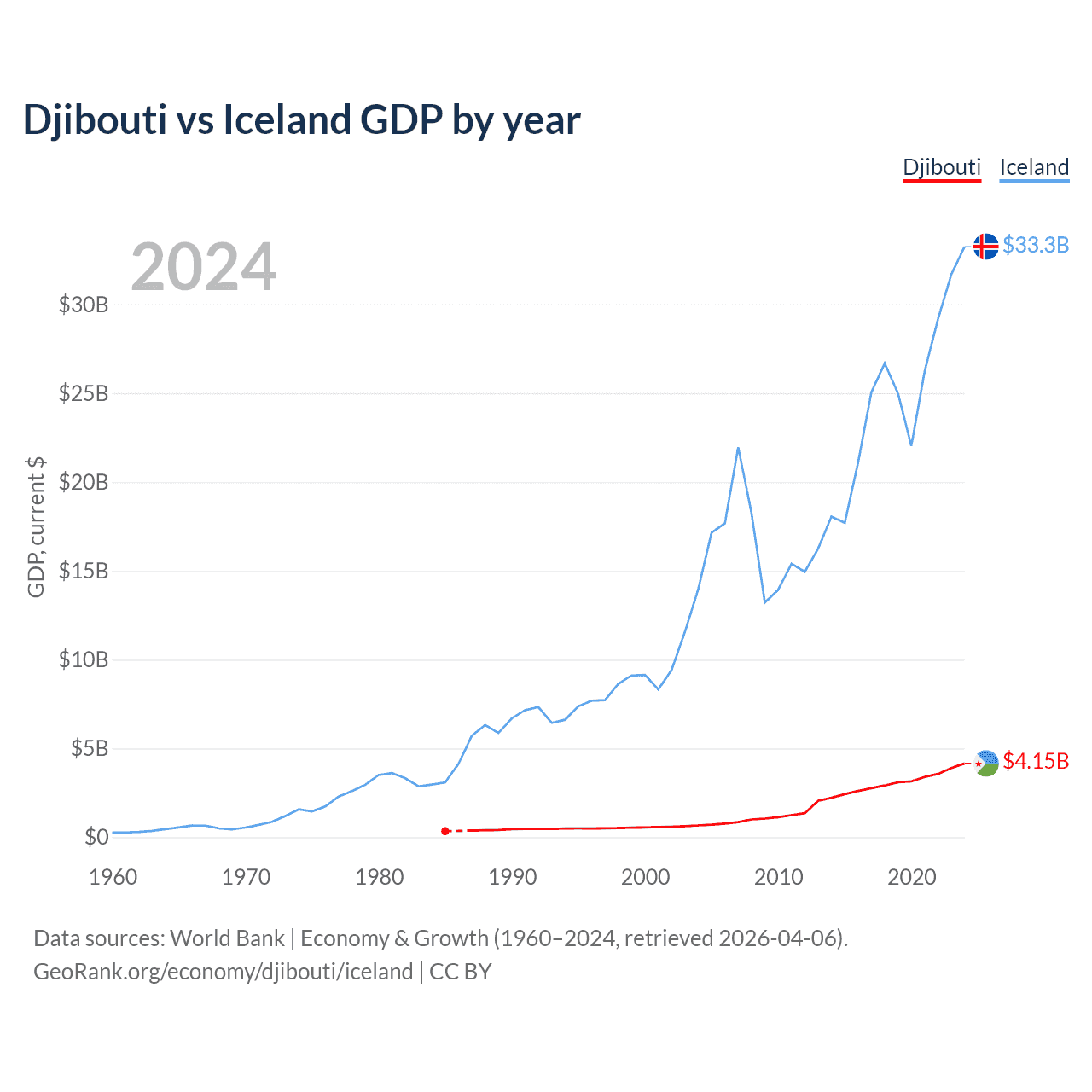 Djibouti has a GDP of $4.15B compared to $33.3B for Iceland, ranking 165/197 and 108/197 by economy size, respectively.