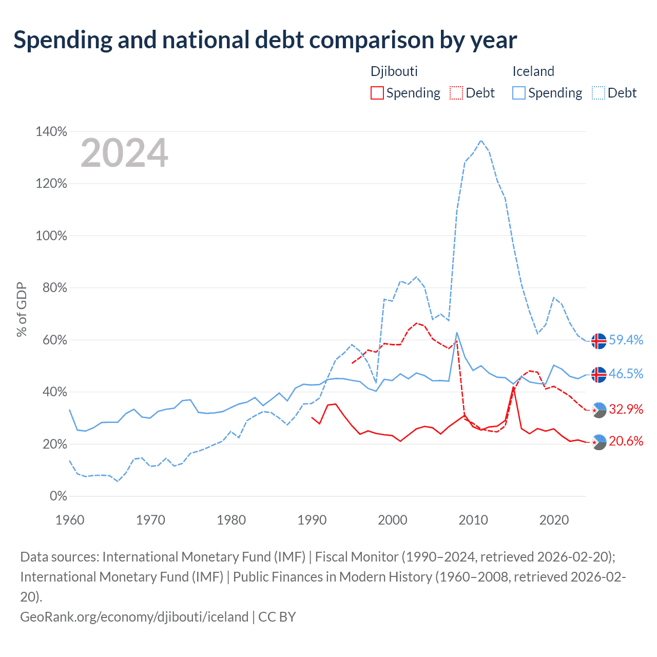 Djibouti has $1.36B in government debt (32.9% of GDP), compared to $19.8B (59.4% of GDP) in Iceland.