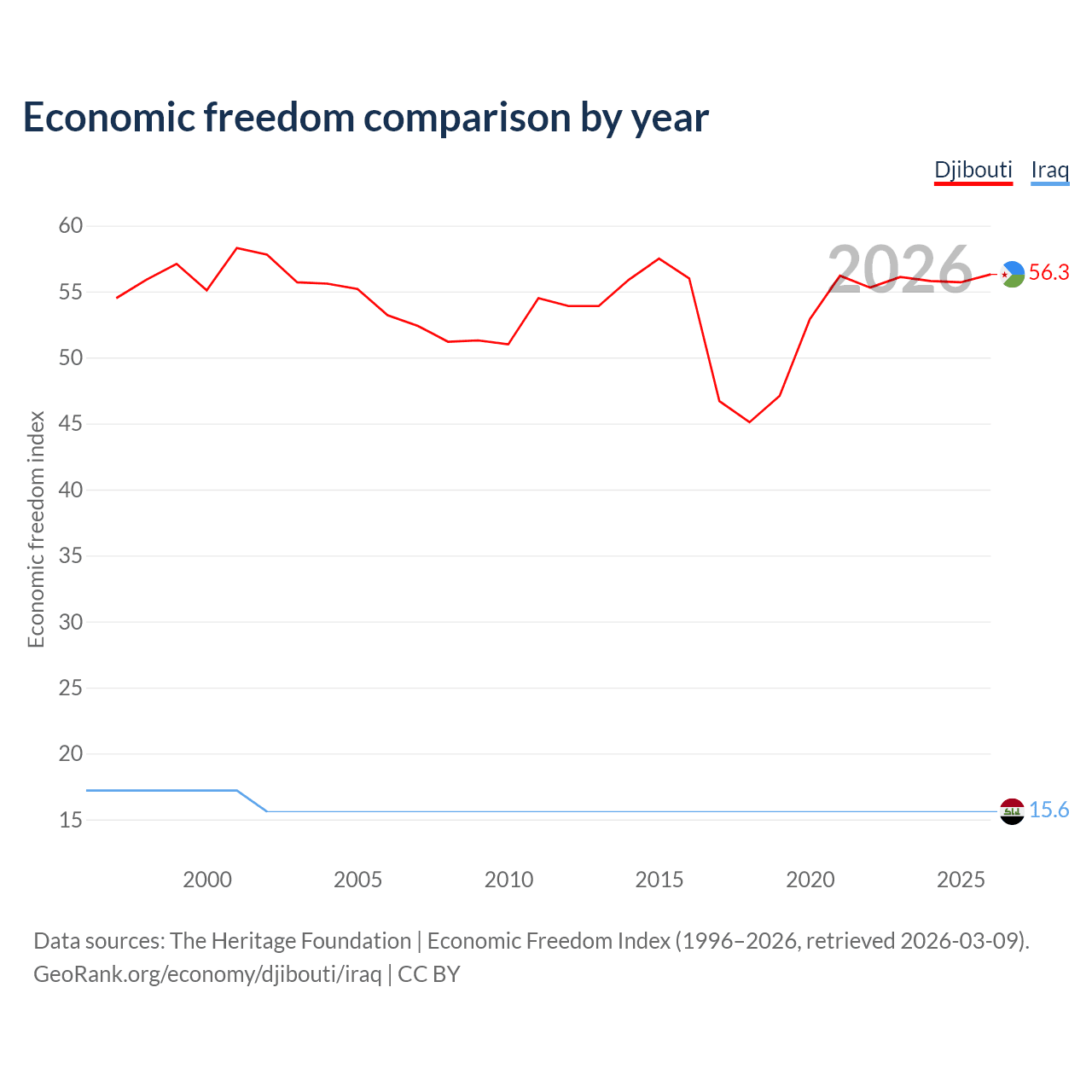 The Economic Freedom Index for Djibouti is 56.3, ranking 122/197, compared to 15.6 for Iraq, ranking 196/197. The chart above displays a comparison of annual changes in economic freedom indexes.