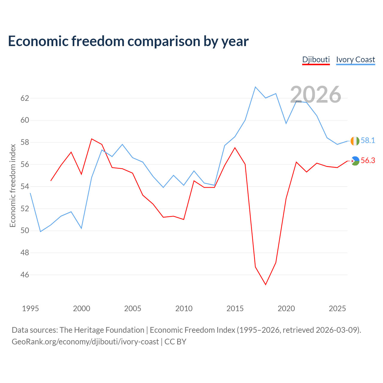 The Economic Freedom Index for Djibouti is 56.3, ranking 122/197, compared to 58.1 for Ivory Coast, ranking 111/197. The chart above displays a comparison of annual changes in economic freedom indexes.
