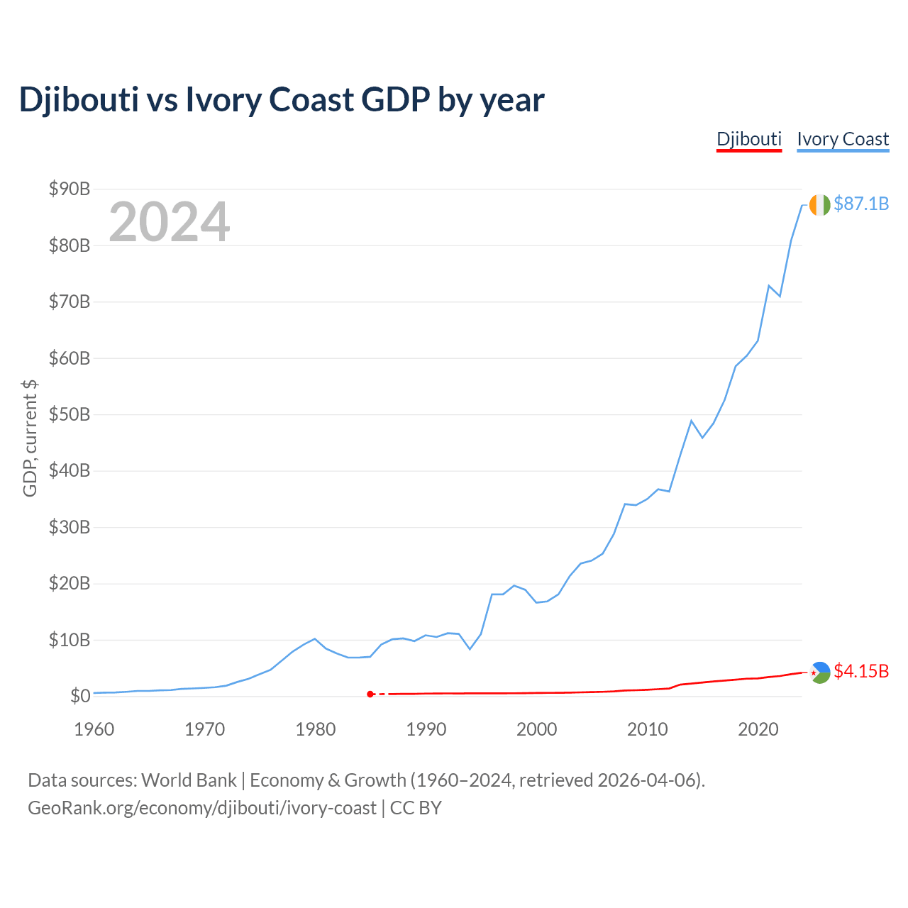Djibouti vs Ivory Coast GDP by year