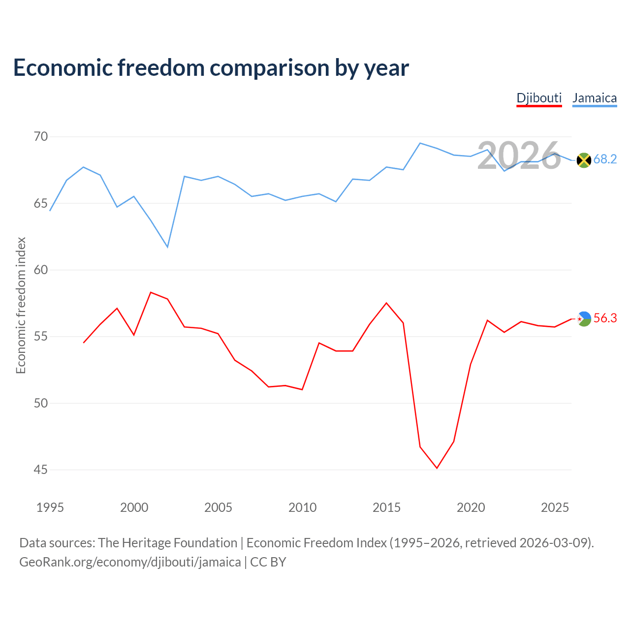 The Economic Freedom Index for Djibouti is 56.3, ranking 122/197, compared to 68.2 for Jamaica, ranking 48/197. The chart above displays a comparison of annual changes in economic freedom indexes.