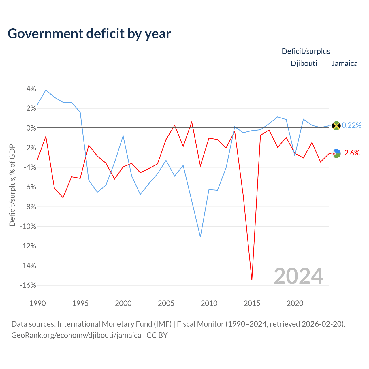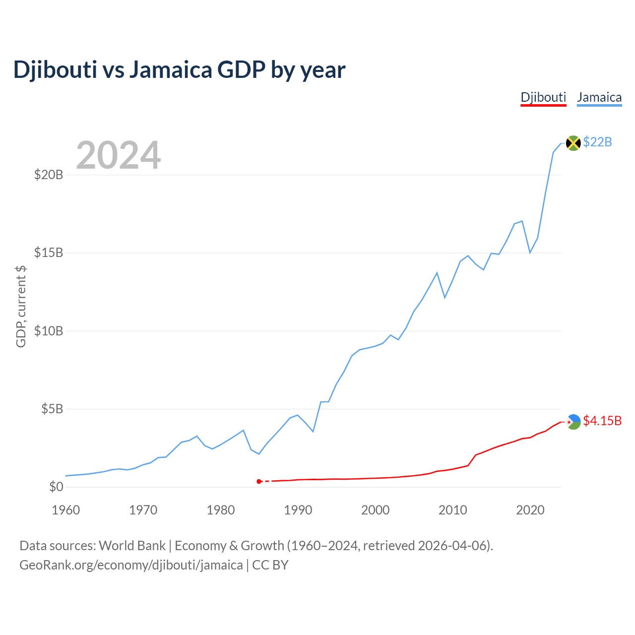 Djibouti has a GDP of $4.15B compared to $22B for Jamaica, ranking 165/197 and 124/197 by economy size, respectively.