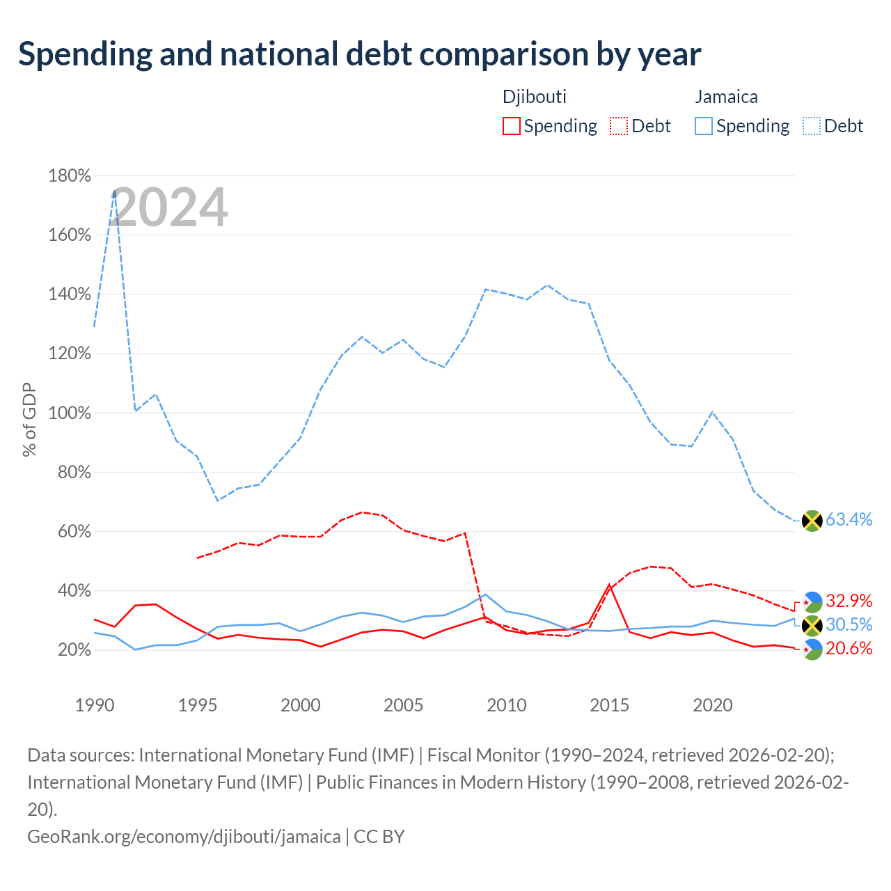 Djibouti has $1.36B in government debt (32.9% of GDP), compared to $14B (63.4% of GDP) in Jamaica.