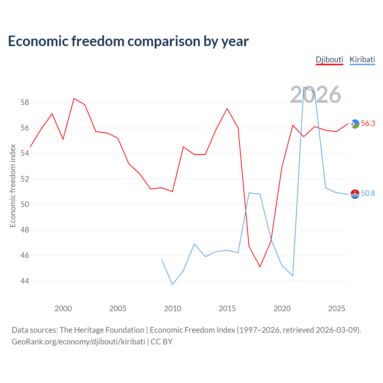 The Economic Freedom Index for Djibouti is 56.3, ranking 122/197, compared to 50.8 for Kiribati, ranking 158/197. The chart above displays a comparison of annual changes in economic freedom indexes.