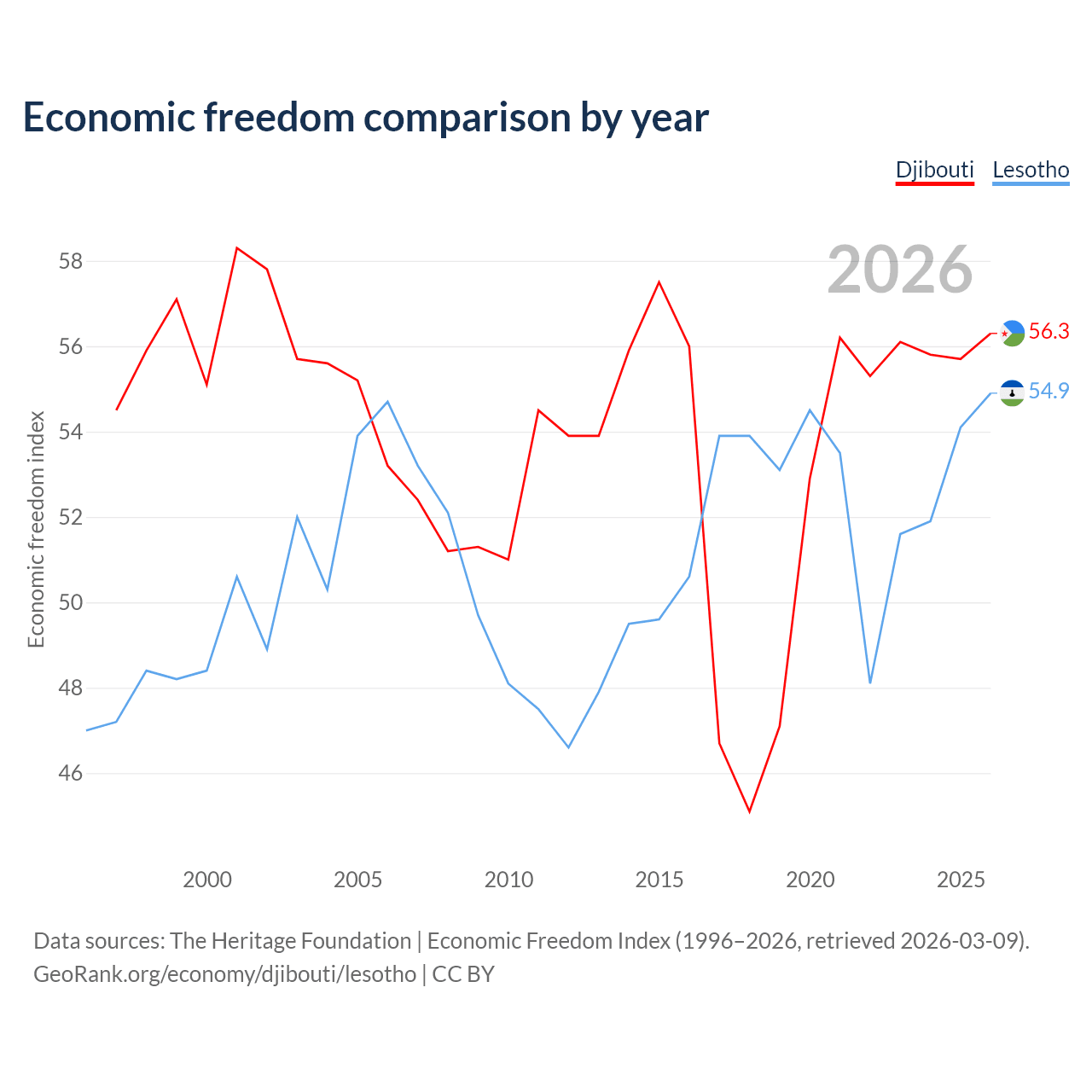 The Economic Freedom Index for Djibouti is 56.3, ranking 122/197, compared to 54.9 for Lesotho, ranking 130/197. The chart above displays a comparison of annual changes in economic freedom indexes.