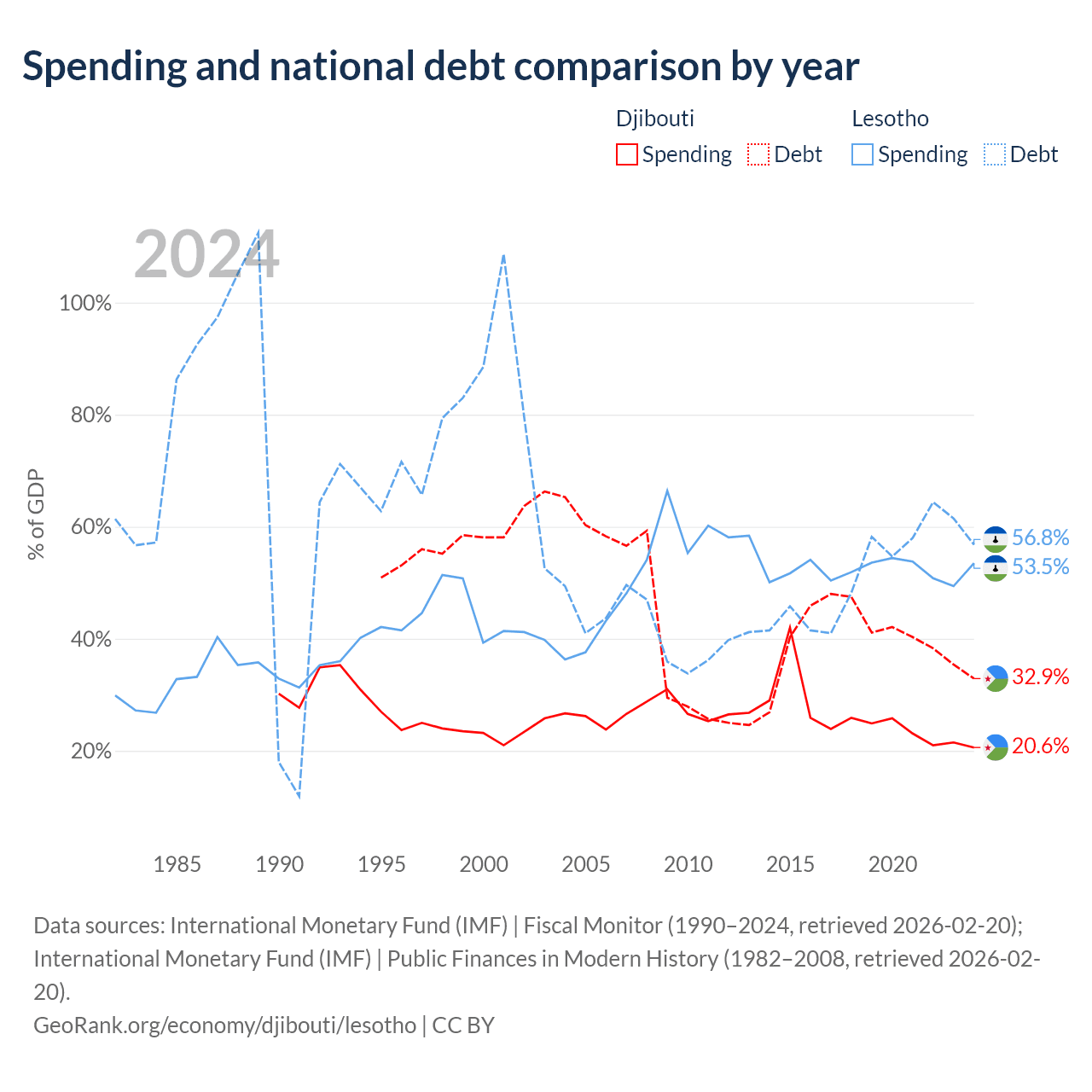 Djibouti has $1.36B in government debt (32.9% of GDP), compared to $1.29B (56.8% of GDP) in Lesotho.