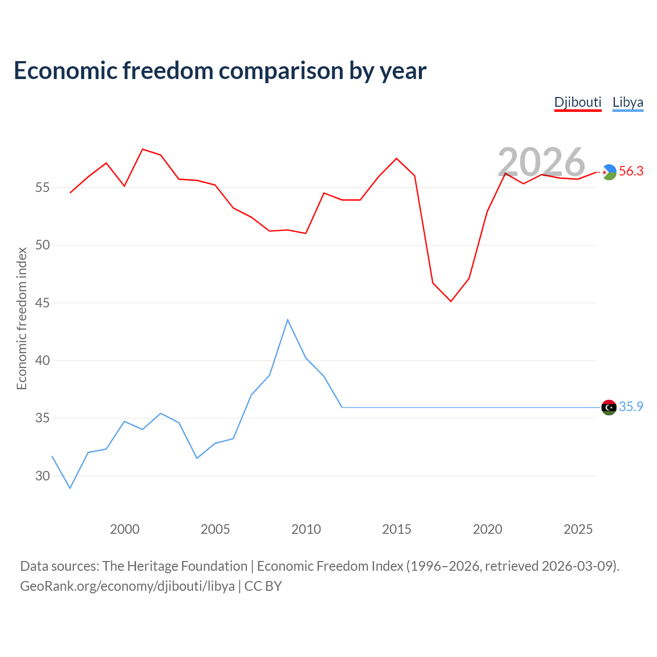 The Economic Freedom Index for Djibouti is 56.3, ranking 122/197, compared to 35.9 for Libya, ranking 189/197. The chart above displays a comparison of annual changes in economic freedom indexes.