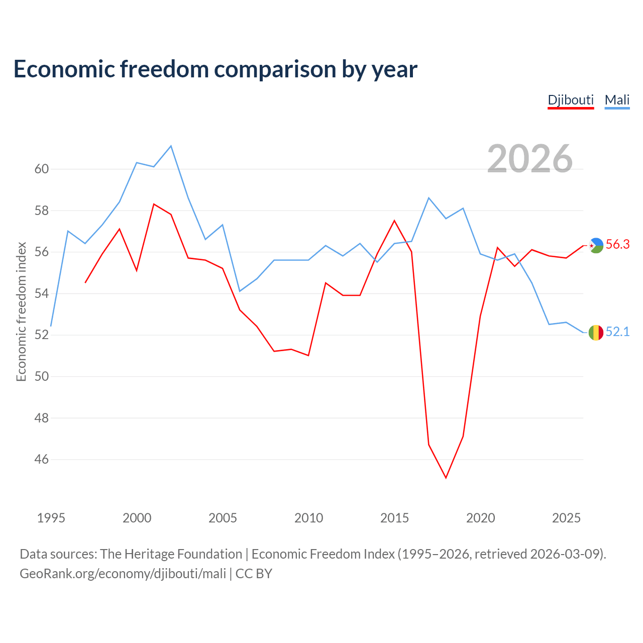 The Economic Freedom Index for Djibouti is 56.3, ranking 122/197, compared to 52.1 for Mali, ranking 150/197. The chart above displays a comparison of annual changes in economic freedom indexes.