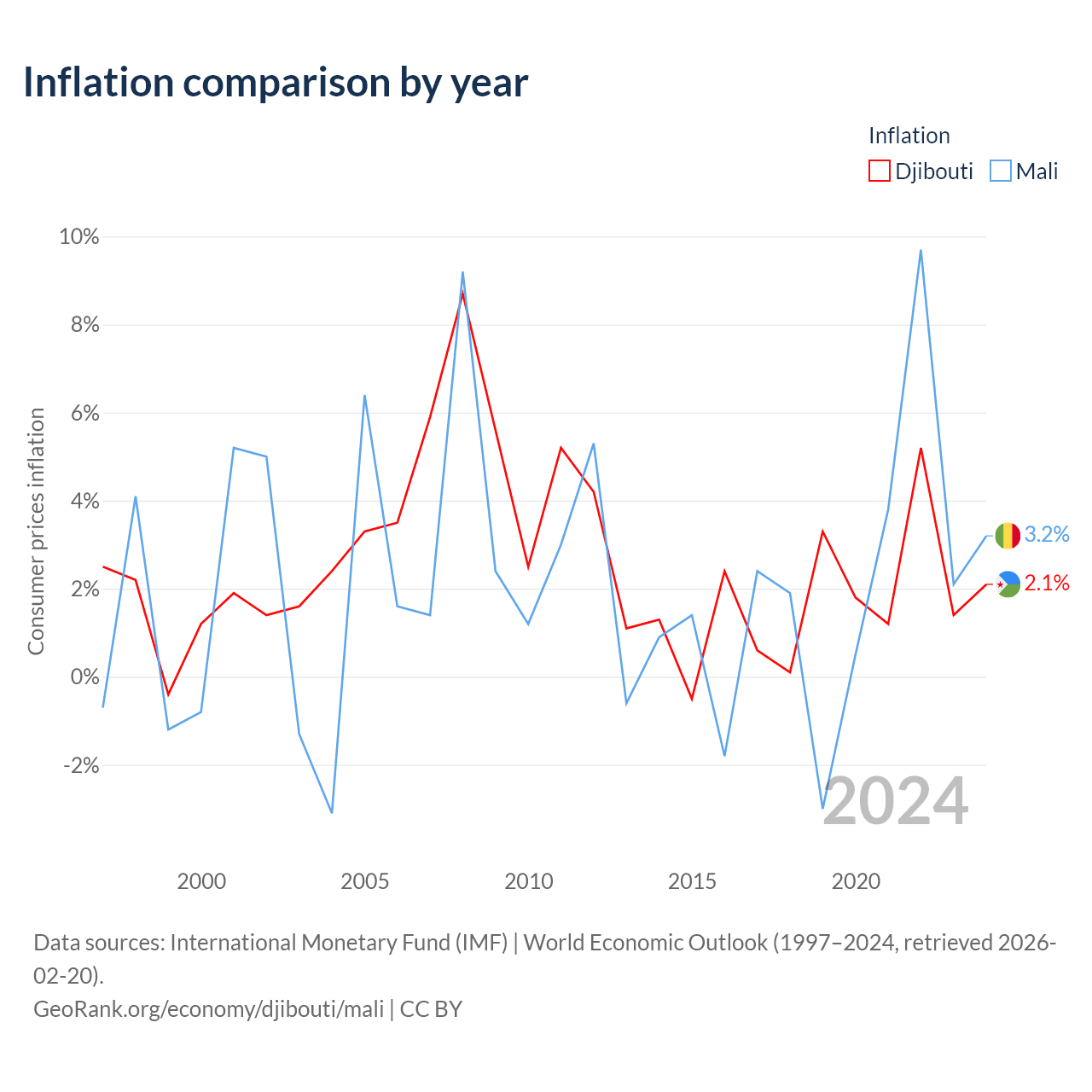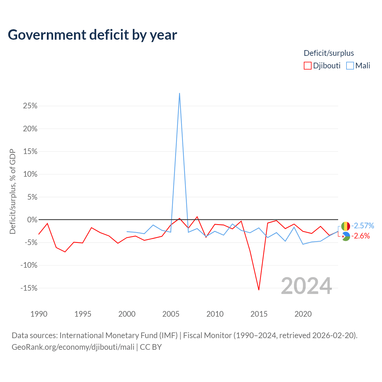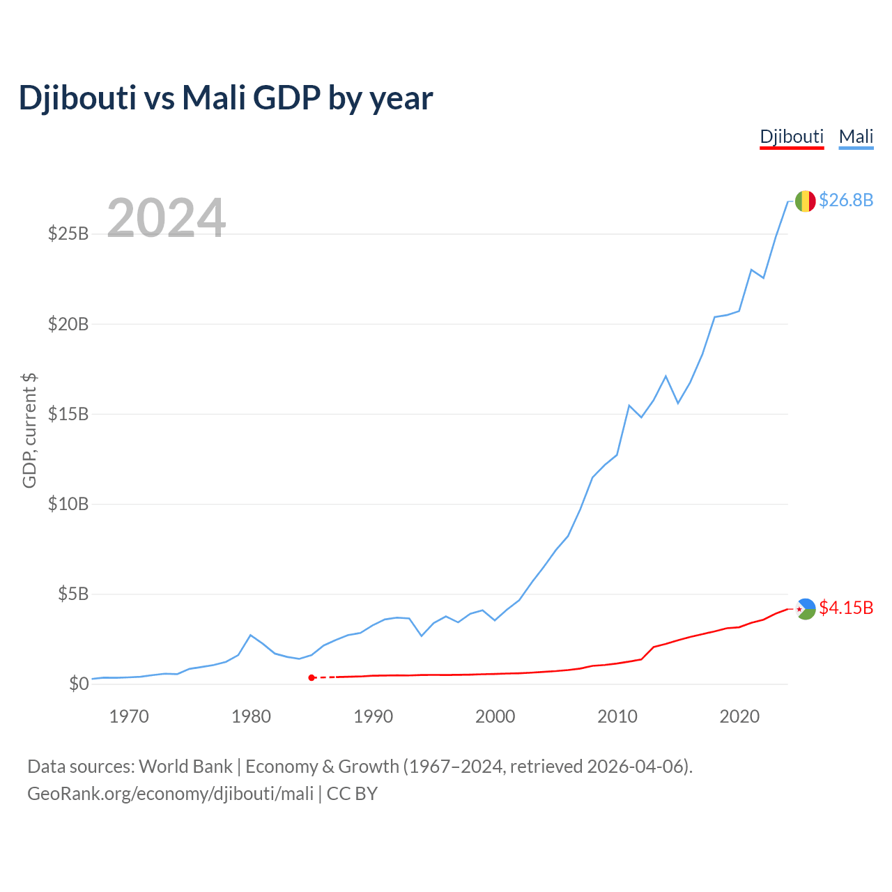 Djibouti has a GDP of $4.15B compared to $26.8B for Mali, ranking 165/197 and 113/197 by economy size, respectively.