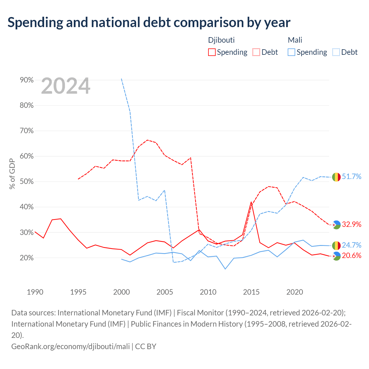 Djibouti has $1.36B in government debt (32.9% of GDP), compared to $13.9B (51.7% of GDP) in Mali.