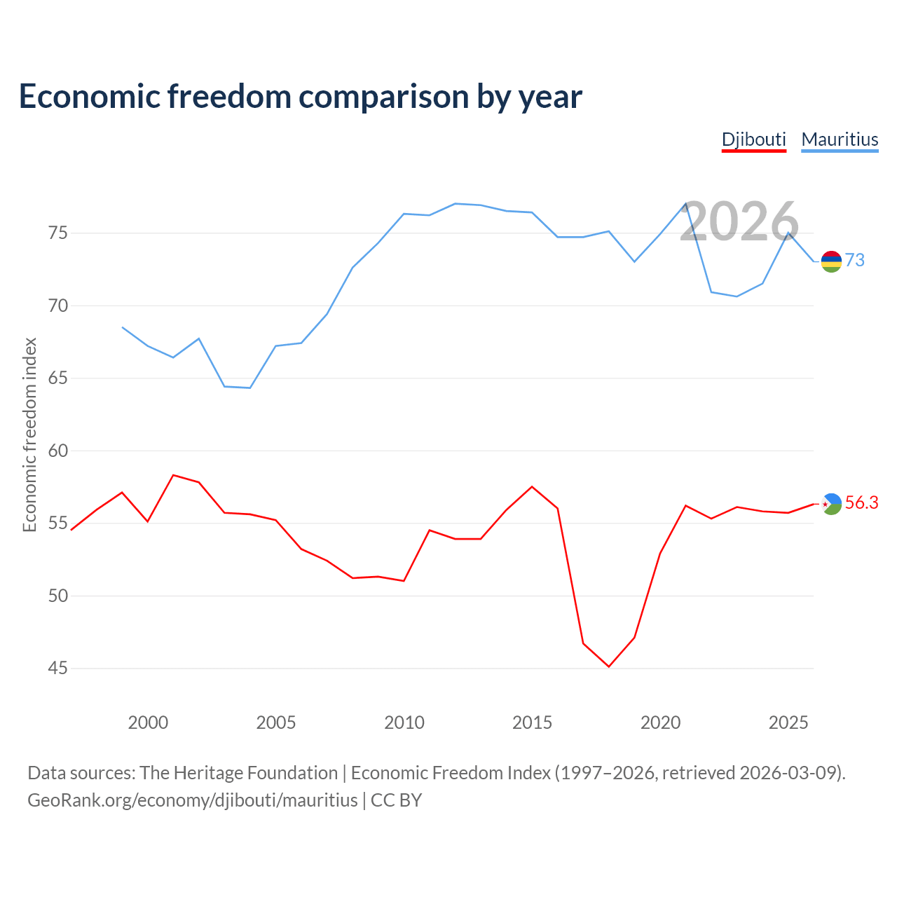 The Economic Freedom Index for Djibouti is 56.3, ranking 122/197, compared to 73 for Mauritius, ranking 26/197. The chart above displays a comparison of annual changes in economic freedom indexes.