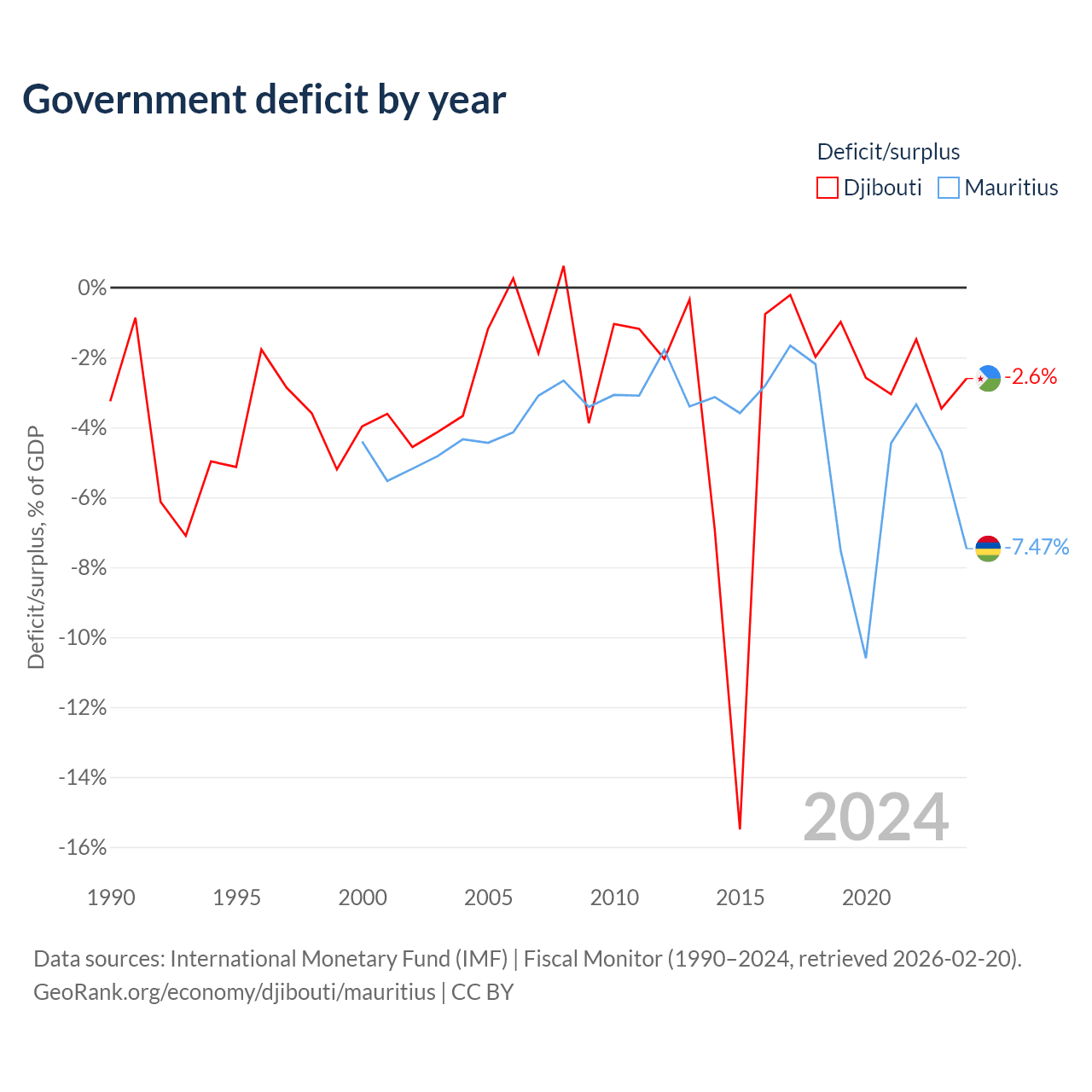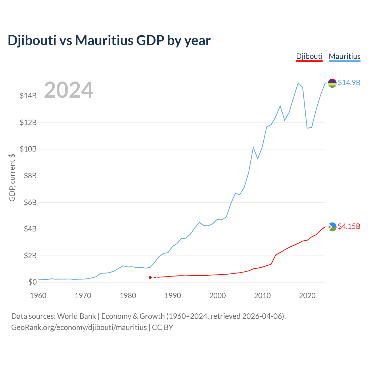 Djibouti has a GDP of $4.15B compared to $14.9B for Mauritius, ranking 165/197 and 143/197 by economy size, respectively.
