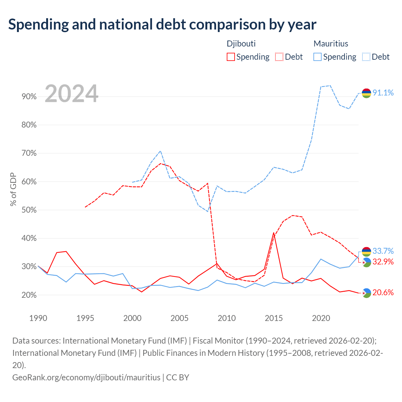 Djibouti has $1.36B in government debt (32.9% of GDP), compared to $13.6B (91.1% of GDP) in Mauritius.