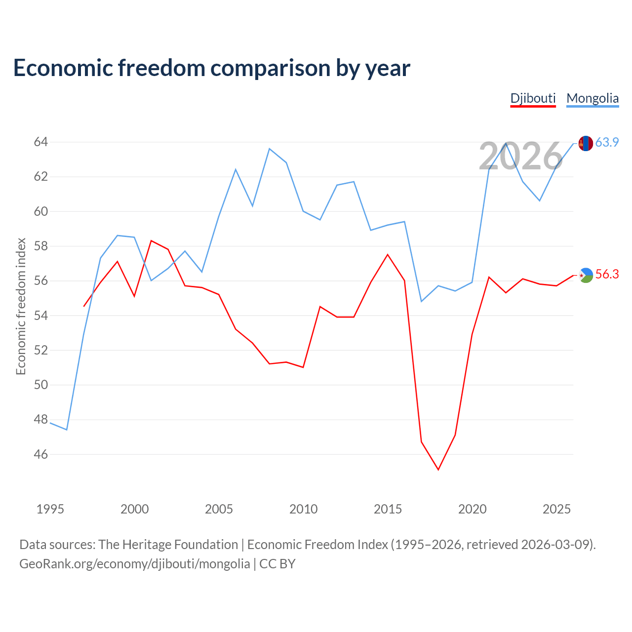 The Economic Freedom Index for Djibouti is 56.3, ranking 122/197, compared to 63.9 for Mongolia, ranking 76/197. The chart above displays a comparison of annual changes in economic freedom indexes.