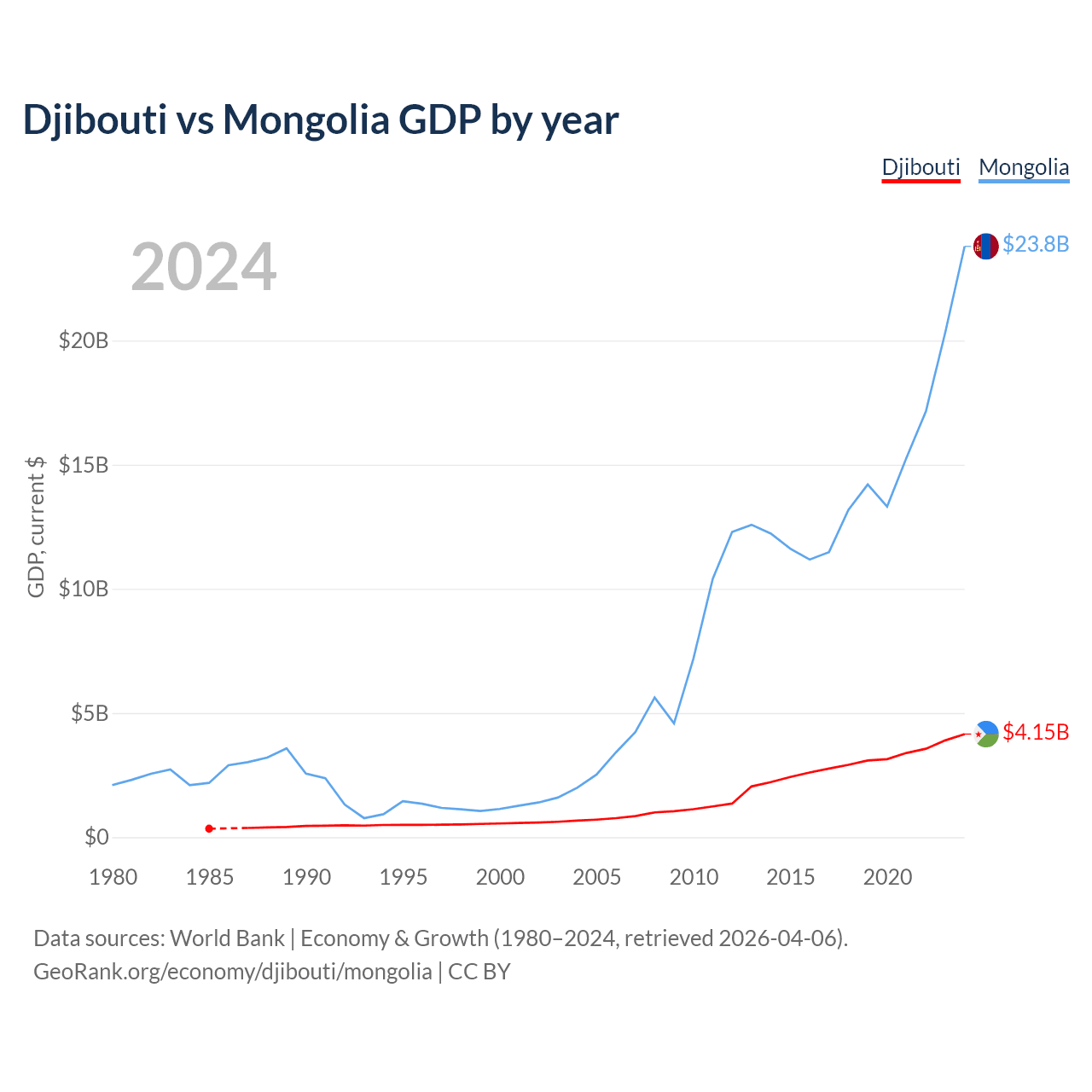 Djibouti has a GDP of $4.15B compared to $23.8B for Mongolia, ranking 165/197 and 121/197 by economy size, respectively.