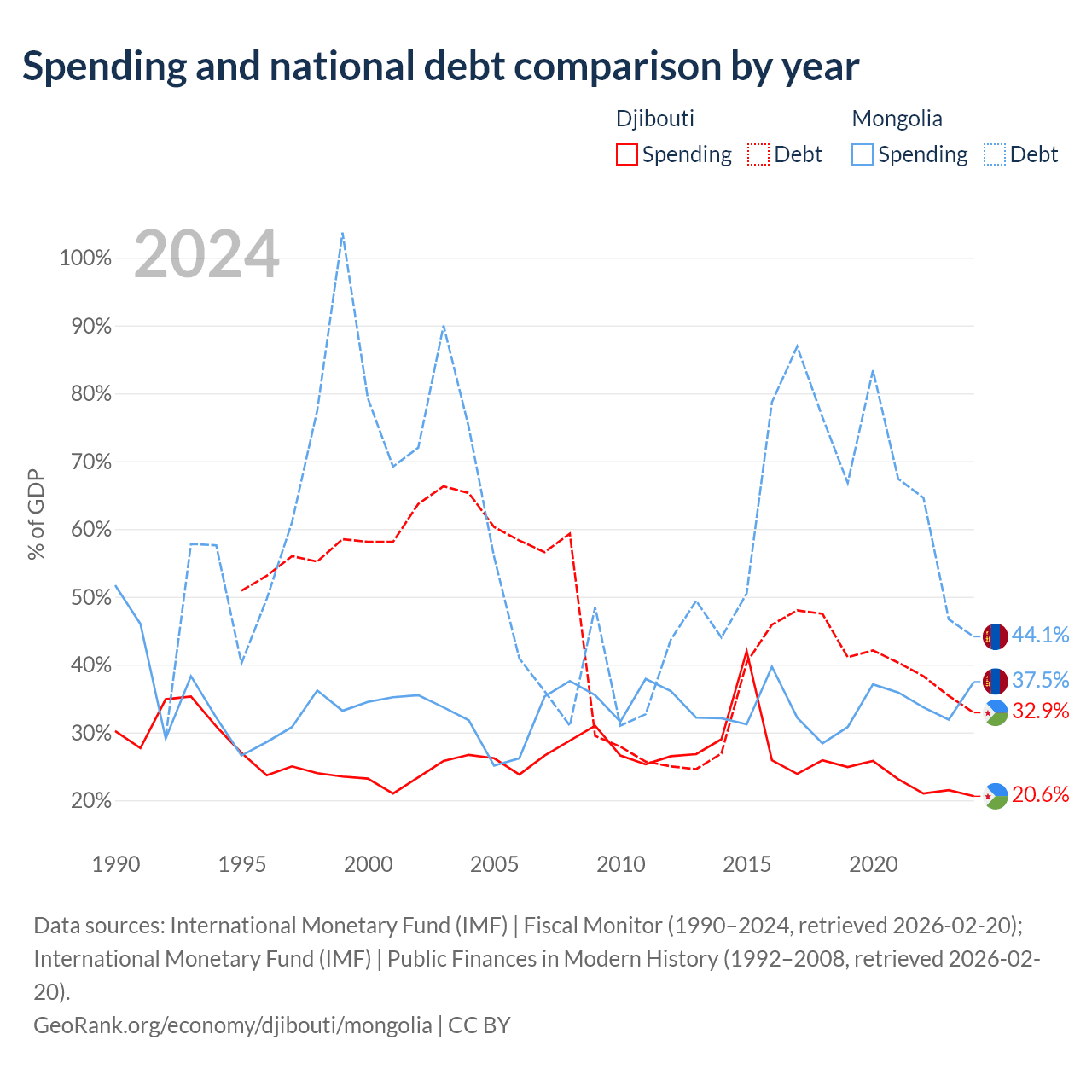 Djibouti has $1.36B in government debt (32.9% of GDP), compared to $10.5B (44.1% of GDP) in Mongolia.