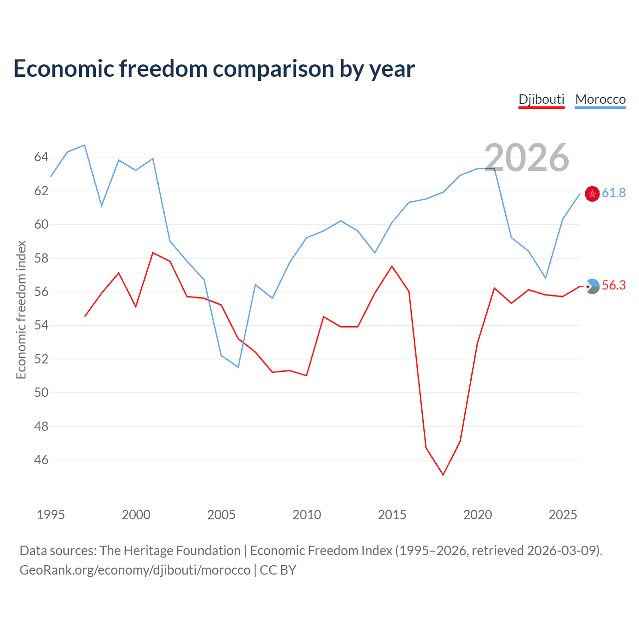 The Economic Freedom Index for Djibouti is 56.3, ranking 122/197, compared to 61.8 for Morocco, ranking 91/197. The chart above displays a comparison of annual changes in economic freedom indexes.
