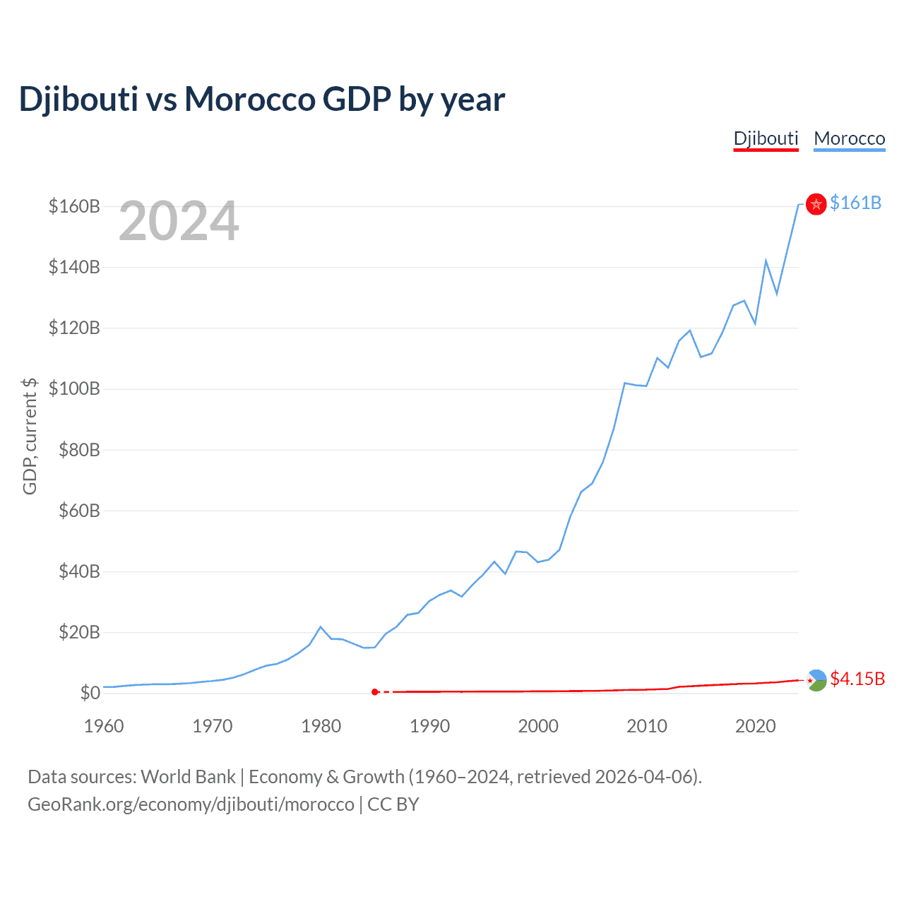 Djibouti has a GDP of $4.15B compared to $161B for Morocco, ranking 165/197 and 58/197 by economy size, respectively.