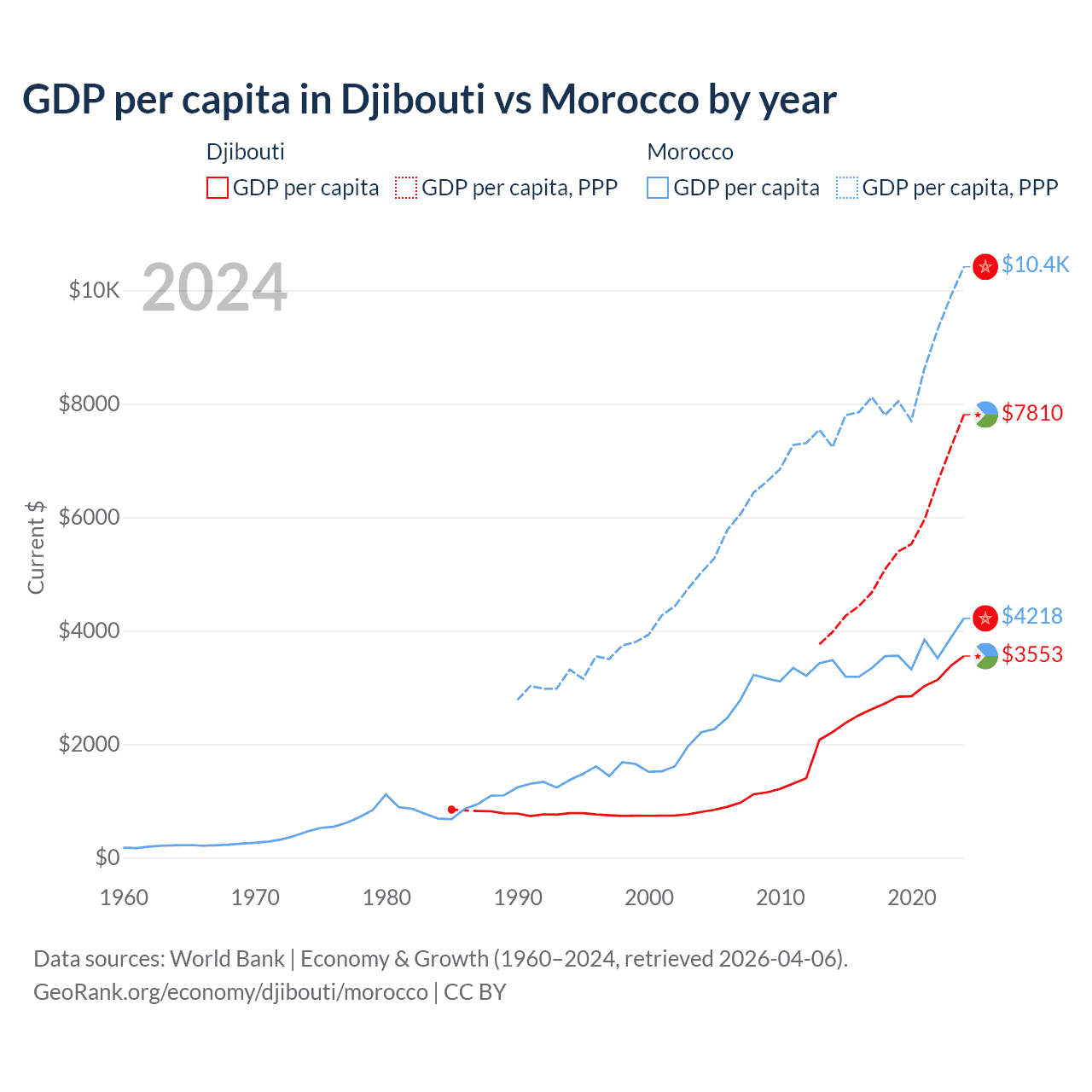Djibouti vs Morocco GDP by year