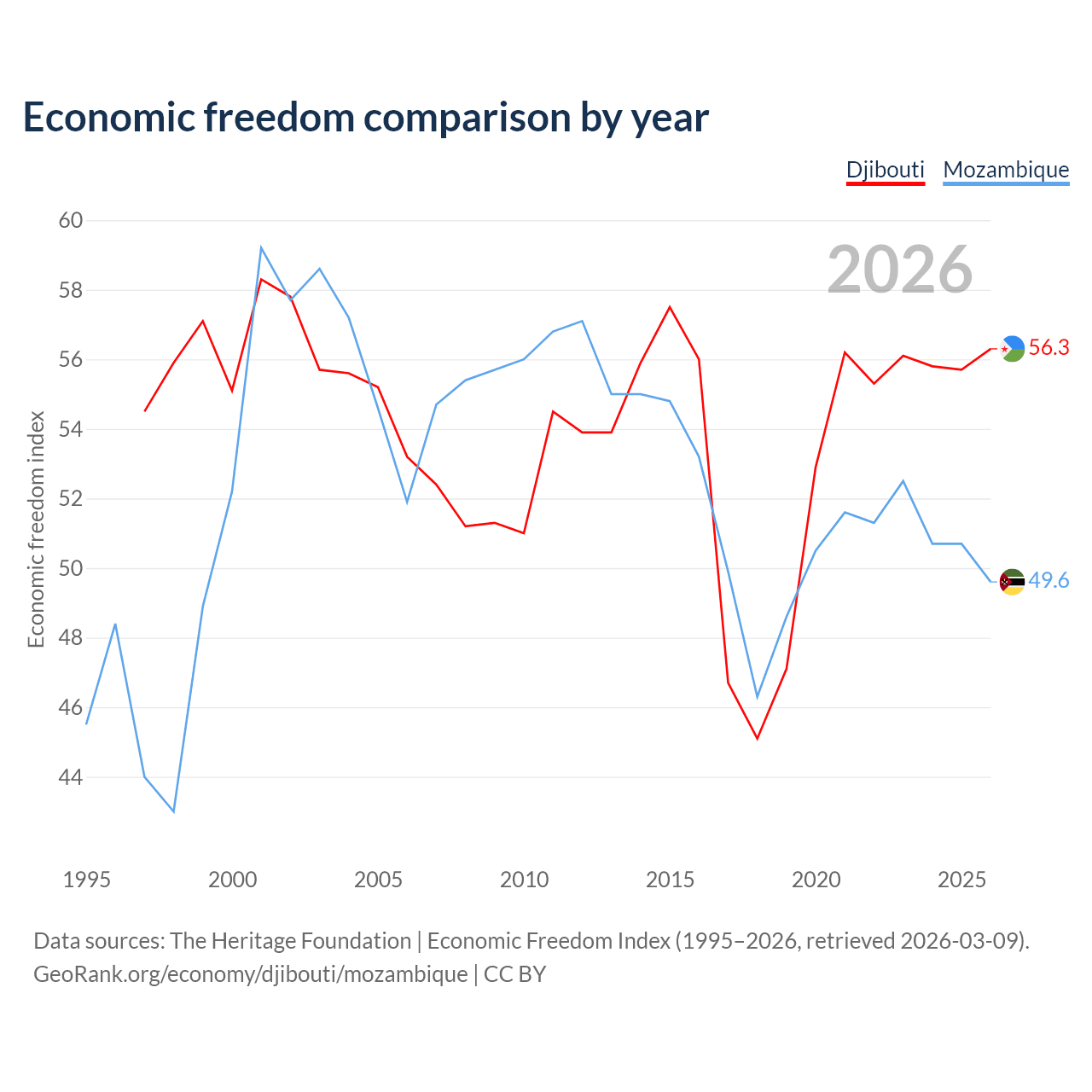 The Economic Freedom Index for Djibouti is 56.3, ranking 122/197, compared to 49.6 for Mozambique, ranking 164/197. The chart above displays a comparison of annual changes in economic freedom indexes.