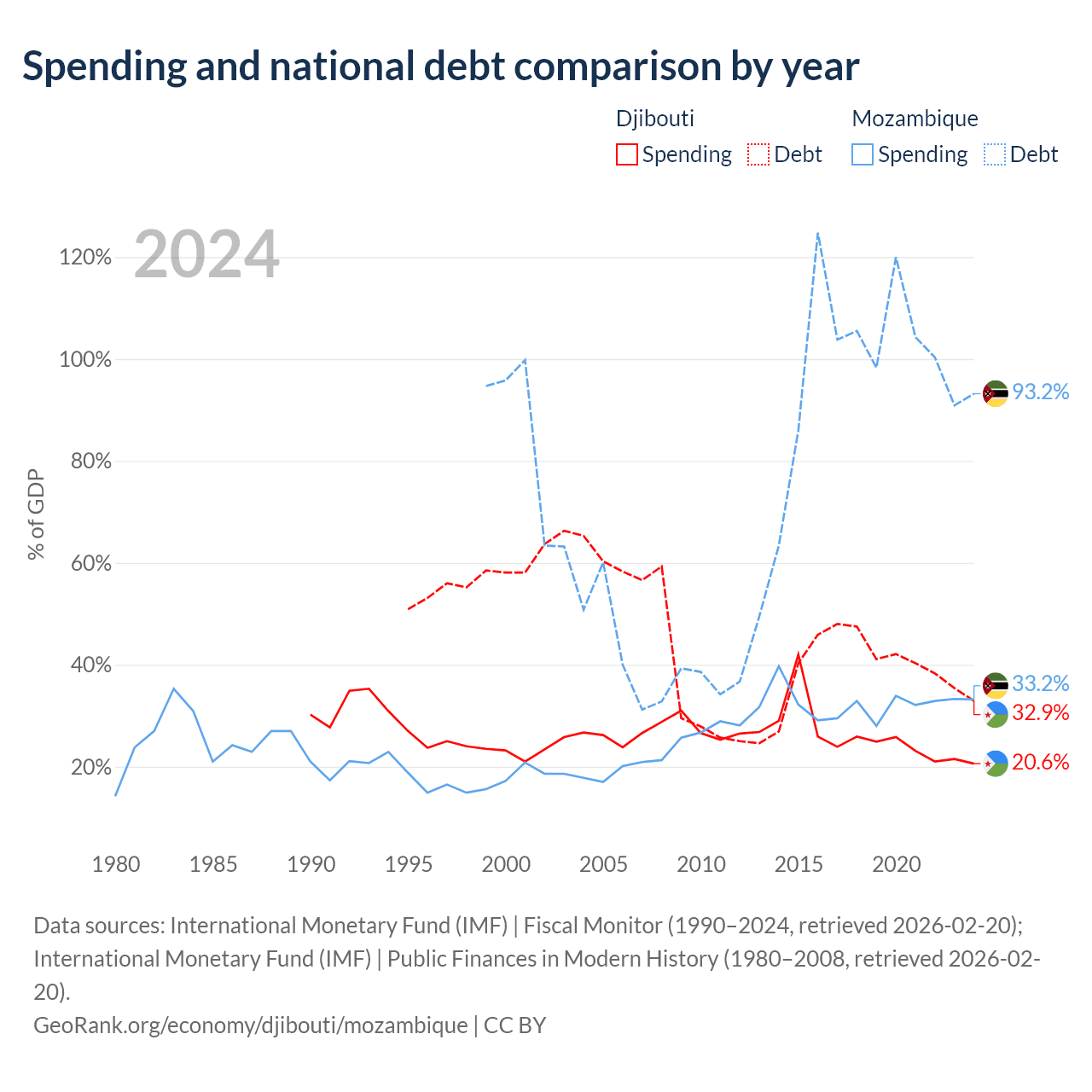 Djibouti has $1.36B in government debt (32.9% of GDP), compared to $21.2B (93.2% of GDP) in Mozambique.